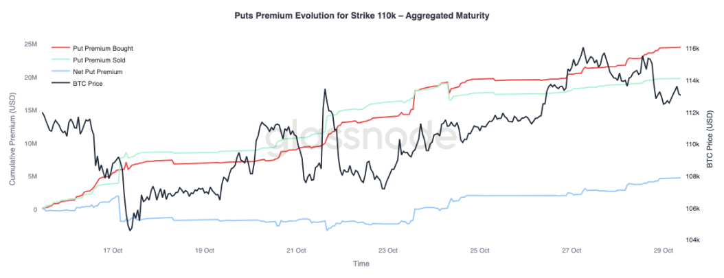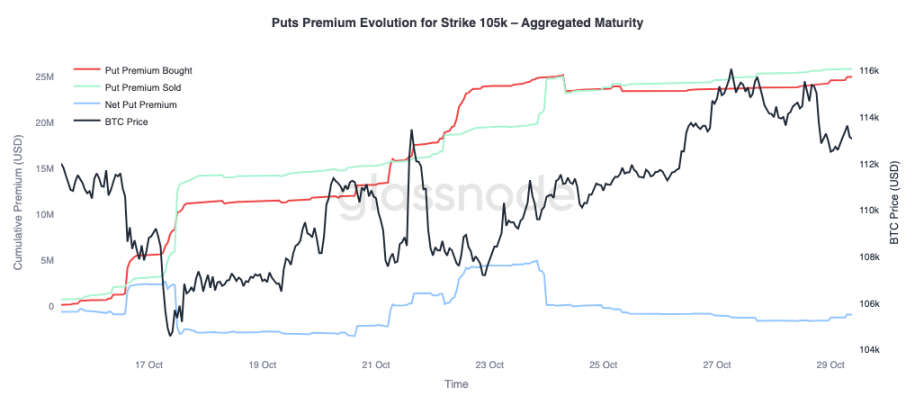 To get a better picture, we can turn to the market's put options. Since October 24, as Bitcoin has surged, traders have been buying $110,000 put options, indicating a need for near-term downside protection. Meanwhile, $105,000 put options have been sold more aggressively, suggesting participants are happy to collect premiums by providing insurance at that deeper strike price.