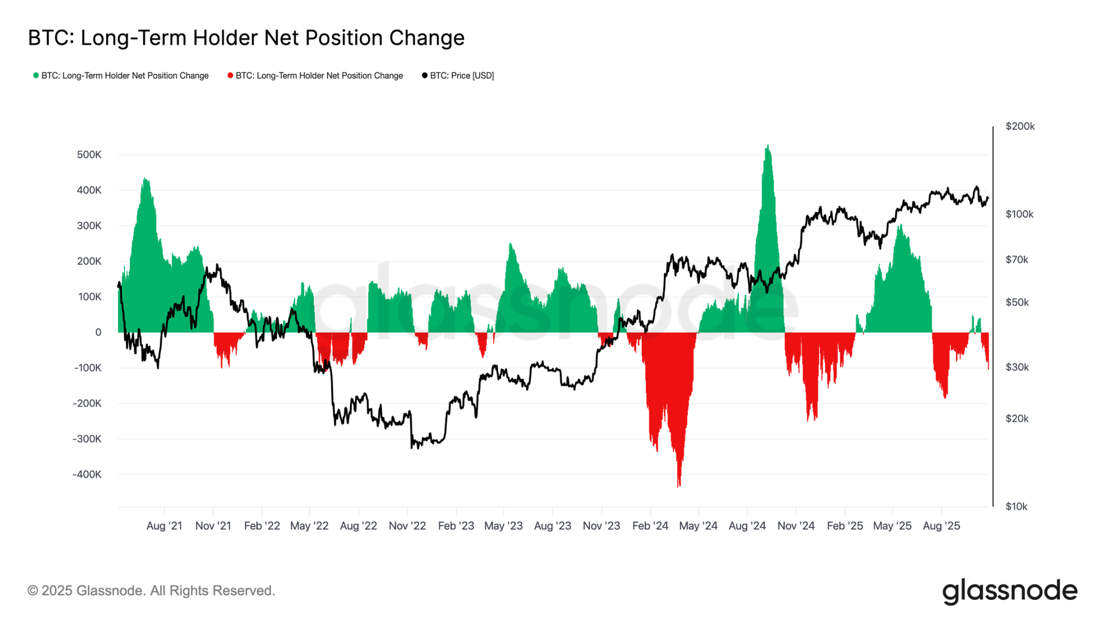 Based on previous observations, continued selling by long-term holders continues to weigh on market structure. The net change in long-term holder positions has fallen to -104,000 BTC per month, highlighting the most significant wave of selling since mid-July.