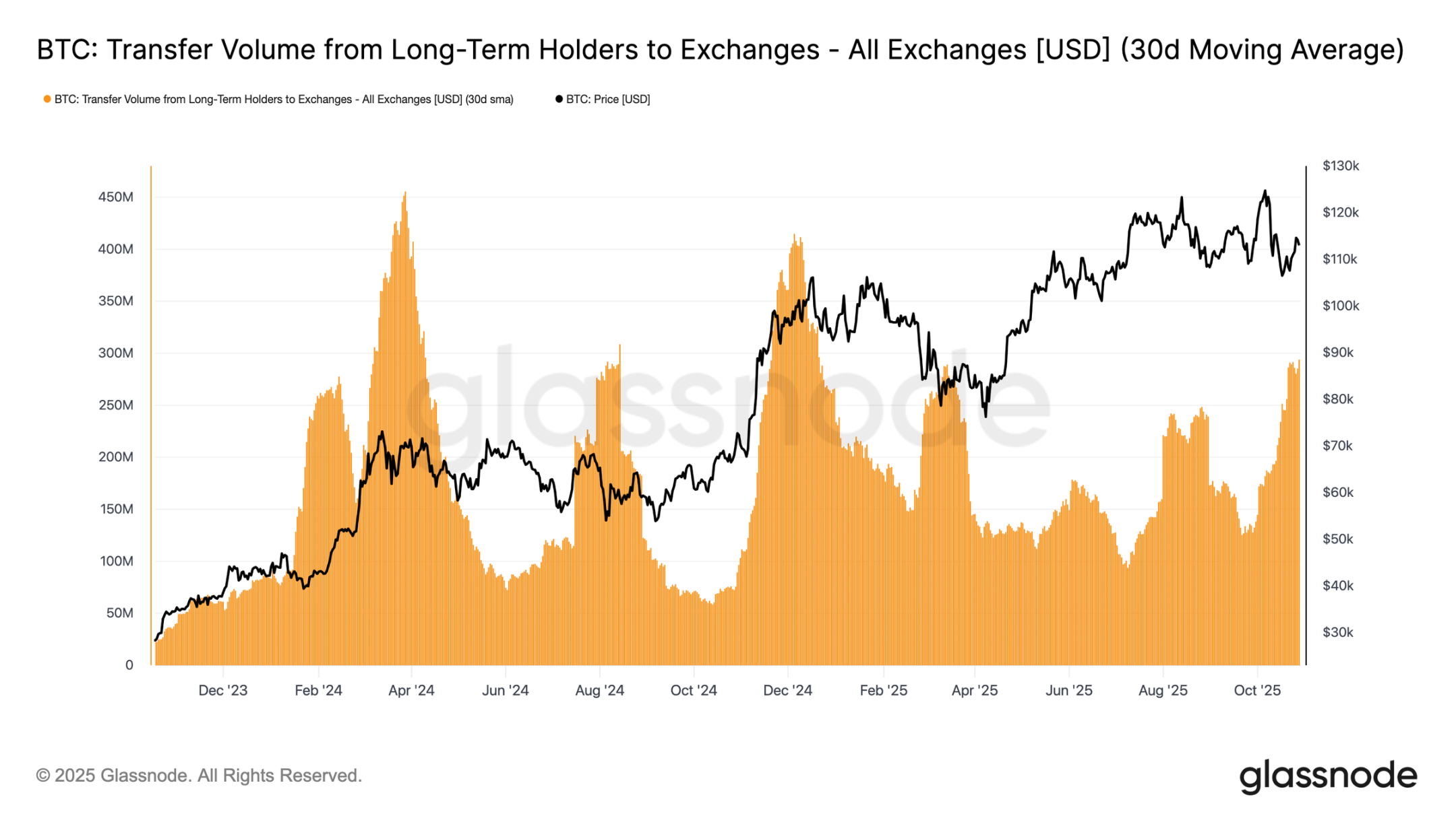 To gauge the intensity of selling by long-term holders, we can turn to the volume of tokens transferred to exchanges by long-term holders (30-day simple moving average), a metric that captures the value of tokens transferred by experienced investors in anticipation of a potential sale. This metric has surged to approximately $293 million per day, more than double the benchmark level of $100 million to $125 million that has been prevalent since November 2024.