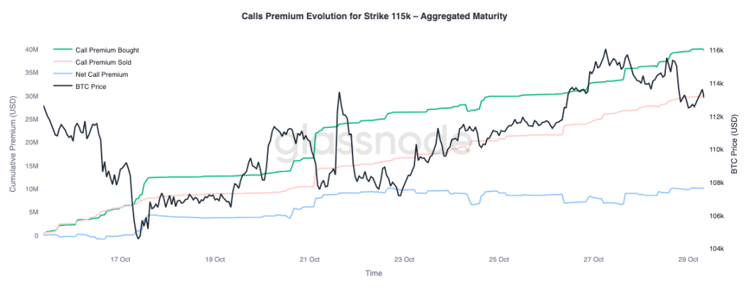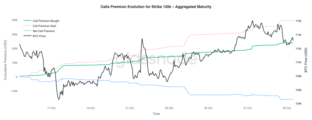 With skewness normalizing, attention has turned to where traders are channeling their premiums. Call option activity now varies significantly depending on the strike price. At a strike price of $115,000, net premiums paid for buying call options remain positive, indicating that traders are continuing to pay for near-term upside as prices have recovered over the past two weeks. In contrast, at a strike price of $120,000, premiums paid for selling call options exceeded those paid for, resulting in a negative net premium.