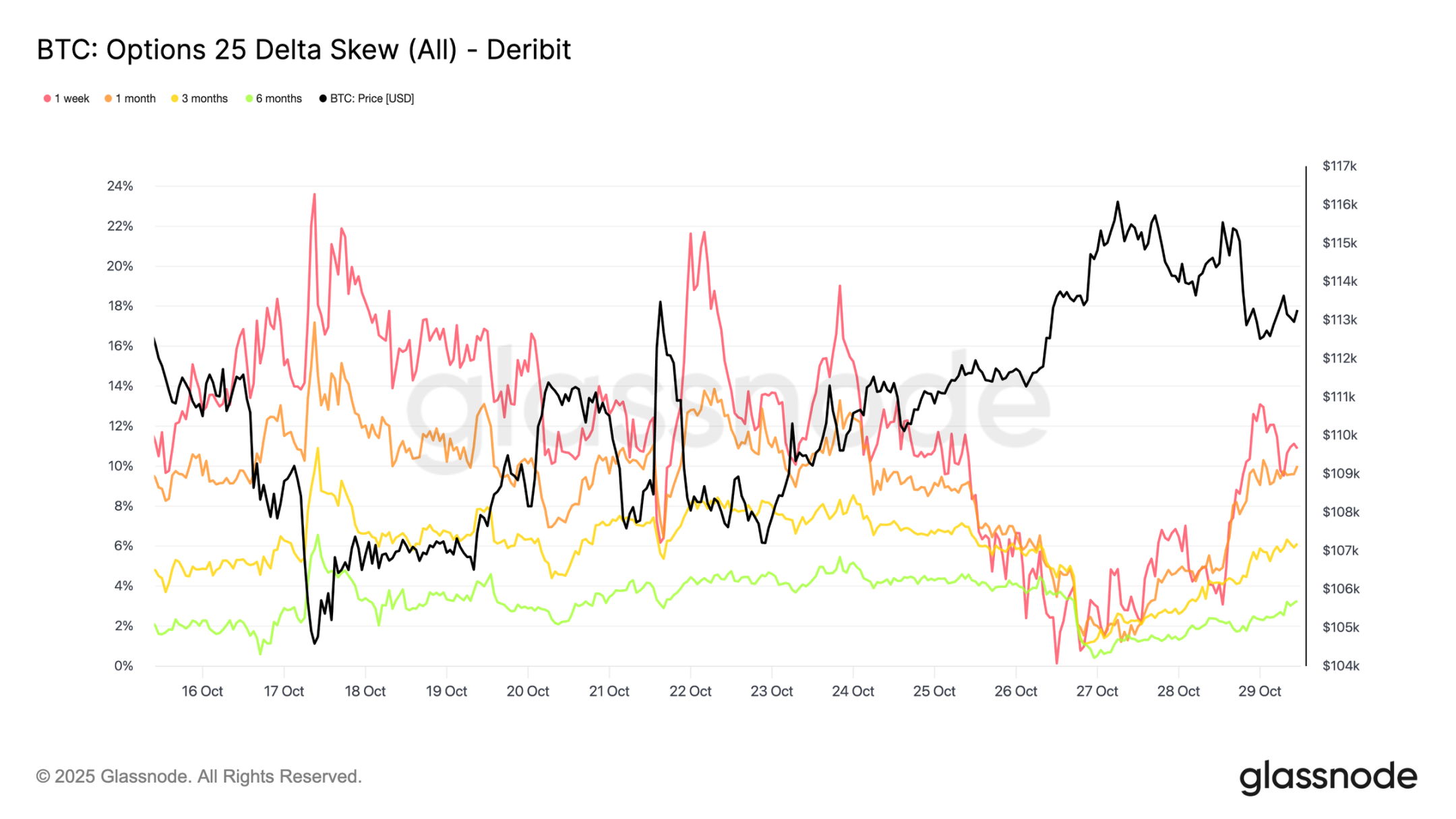 Longer-term contracts, such as 1-month and 3-month terms, have also reset sharply, showing only modest put option premiums. This shift suggests that traders have removed most of their downside hedging. Positions are now closer to "mildly bullish/two-way" rather than "panic lows," consistent with the broader stability seen in Bitcoin's recent price action.