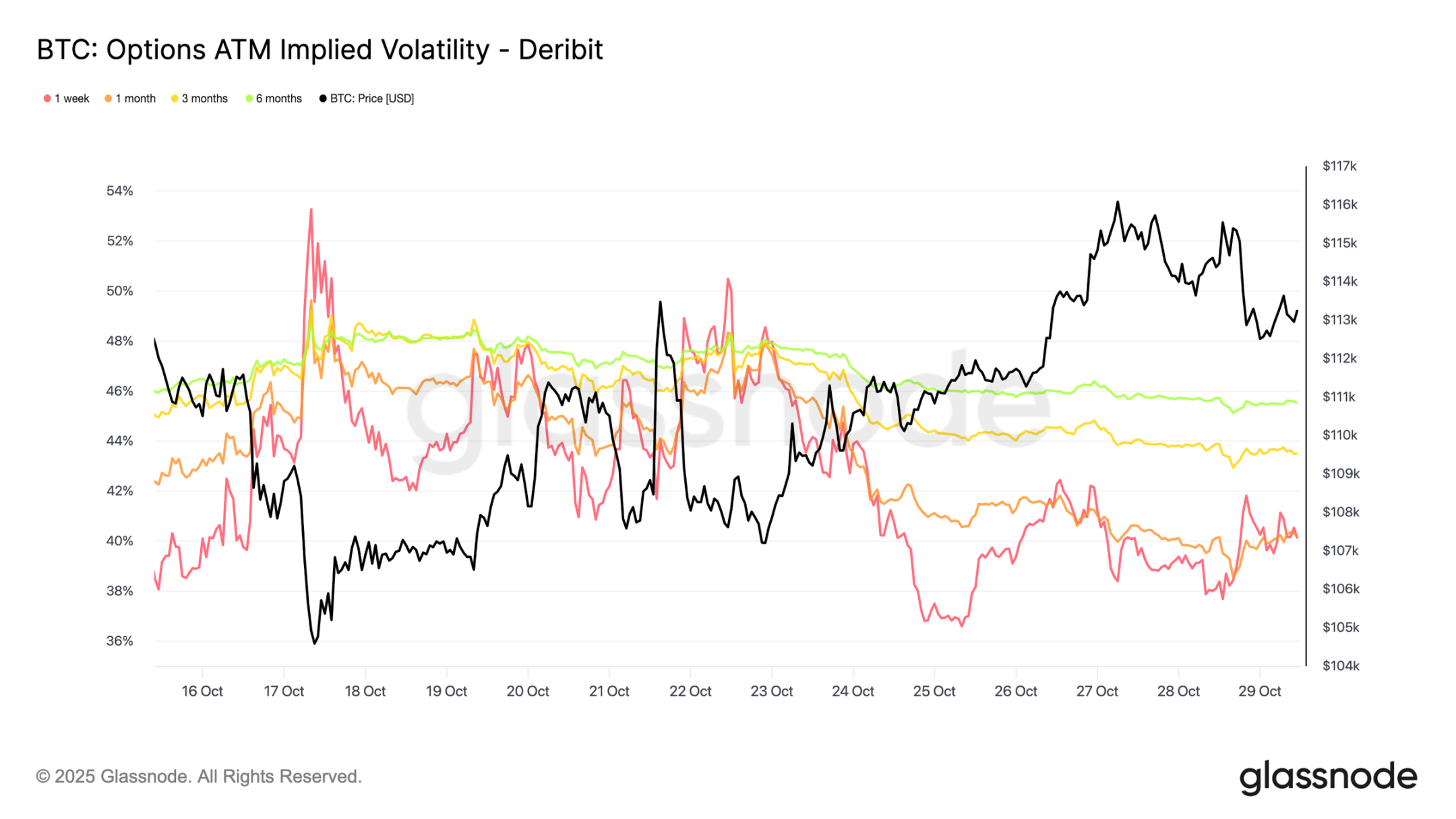 Turning to the options market, recent data shows that volatility pressures following the October 10th crash continue to ease. Bitcoin's 30-day realized volatility has fallen to 42.6%, slightly lower than last week's 44%, reflecting a calmer price action. Meanwhile, implied volatility, representing traders' expectations, has declined more sharply as participants unwind downside hedging and reduce their need for protection.