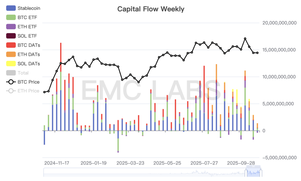 In the new market structure, the main forces bearing the selling pressure, DATs companies and BTC Spot ETF channel funds, also performed weakly this week. According to eMerge Engine statistics, the total capital inflow into the crypto market this week was only 943 million, the lowest in several months.