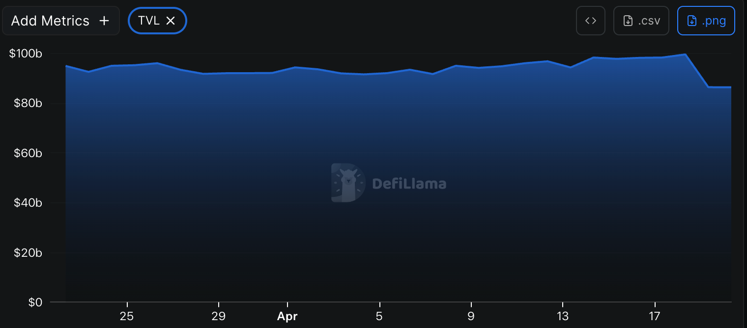 据DeFiLlama的数据,本周DeFi总TVL为$862.75亿,较上周$948.71亿,下降约9.06%。