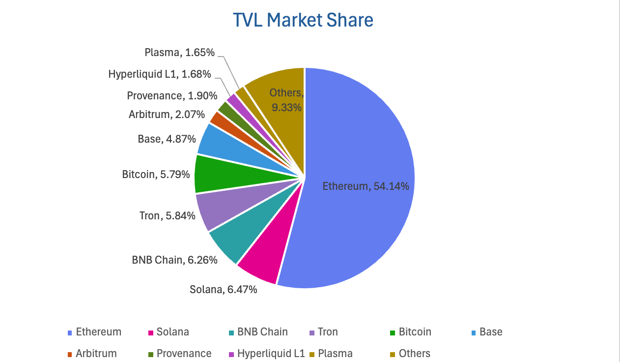 按公链进行划分,其中TVL最高的三条公链分别是Ethereum链,占比54.14%;Solana链,占比6.47%;BNB Chain,占比6.26%。