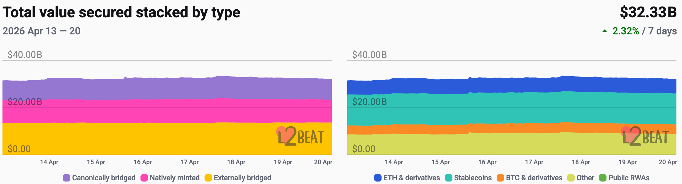 据L2Beat数据显示,本周以太坊Layer2总TVL为$323.3亿,较上周$315.9亿上涨2.34%。