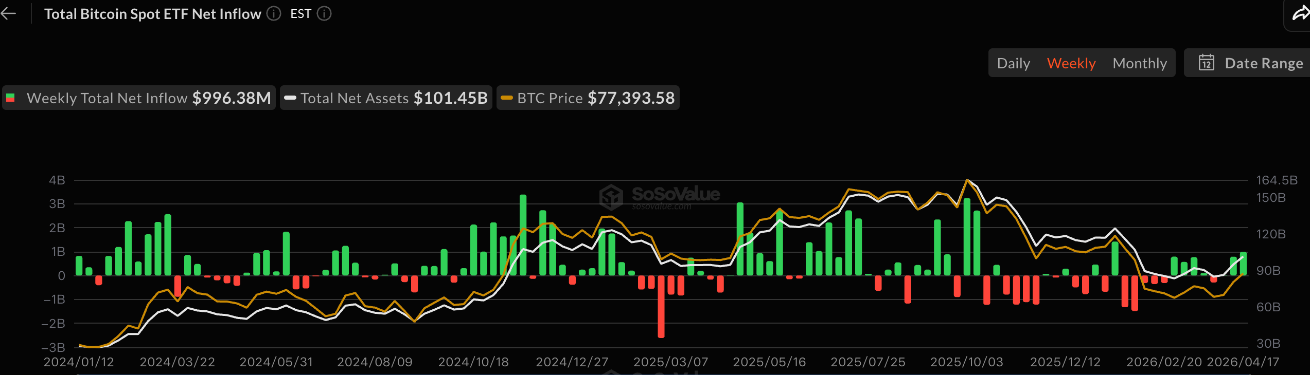 截止至发稿,美国比特币现货ETF累计总净流入约577.4亿美元,本周净流入9.96亿美元;美国以太坊现货ETF累计总净流入约116.7亿美元,本周净流入1.87亿美元。