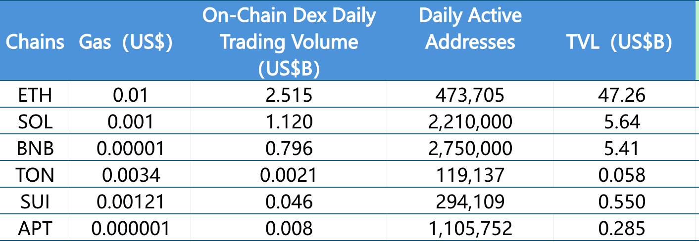主要从日交易量、日活跃地址、交易费用分析目前主要Layer1含ETH、SOL、BNB、TON、SUI以及APTOS的相关数据。