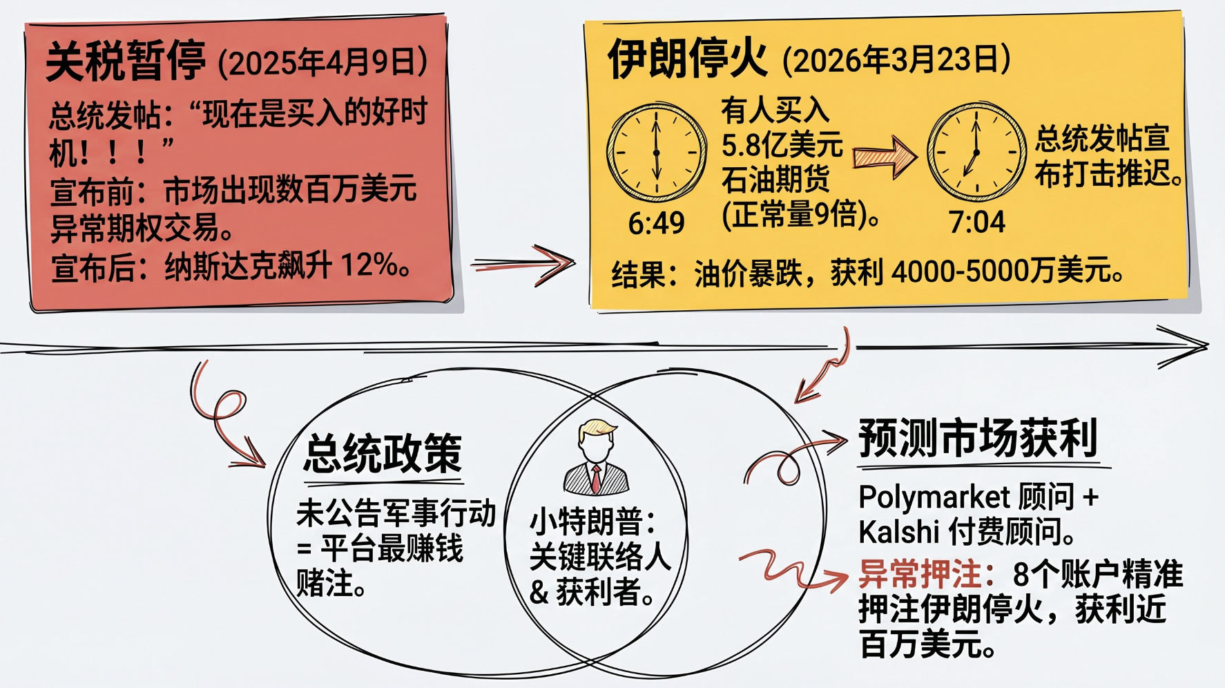 伊朗事件(2026年3月23日):总统发文称将打击伊朗发电站后,油价走高。次日早上6:49,即总统宣布"谈判进展顺利、打击推迟"的15分钟前,市场出现5.8亿美元石油期货买单(约6,200份合约,是日常均值的9倍)。油价随后下跌,道琼斯指数单日上涨约1,000点,涉事头寸估计获利4,000万至5,000万美元。