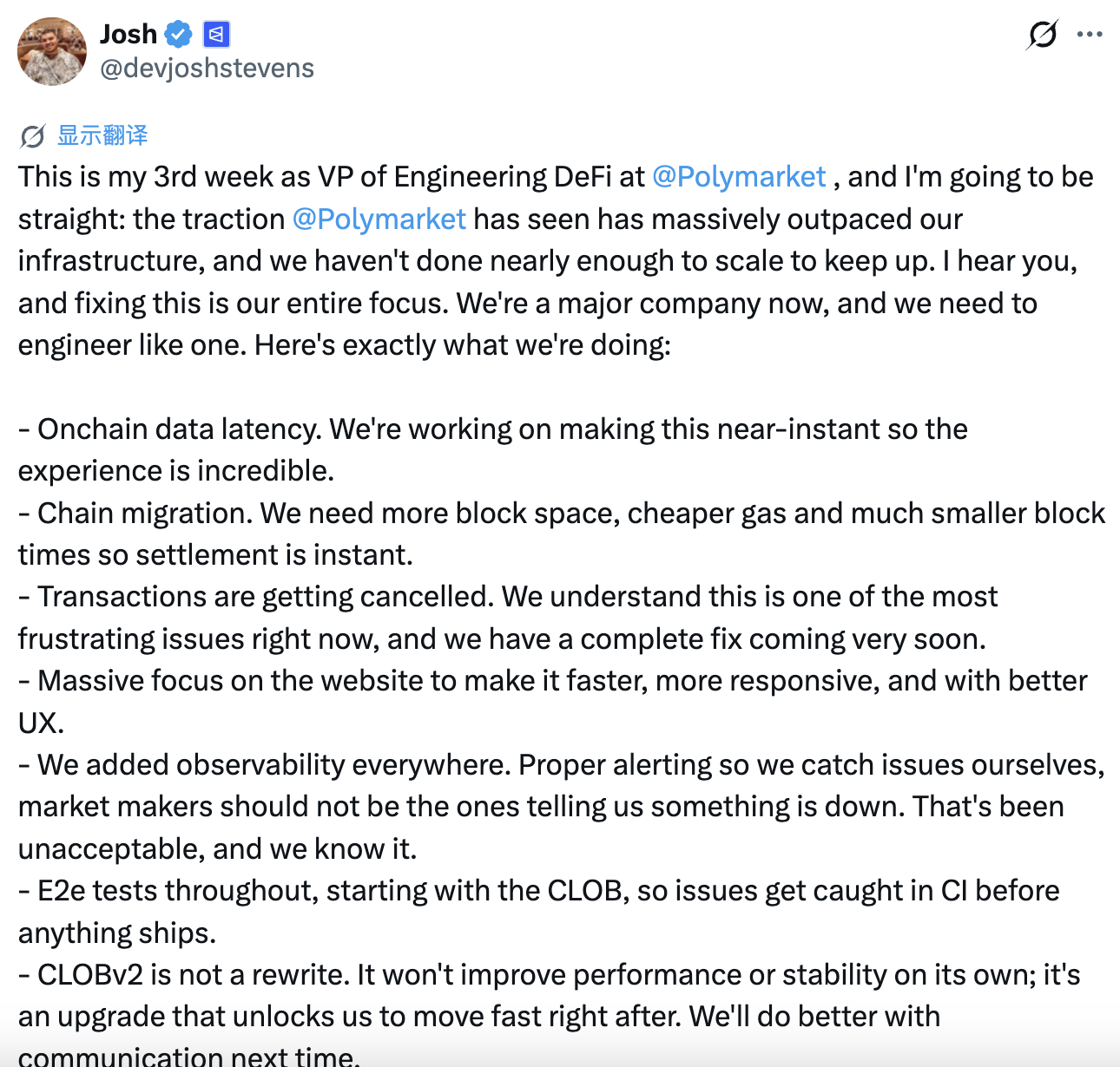 Josh Stevens坦言,目前公司的工程能力尚未匹配其業務成長速度,過去一段時間確實讓用戶失望。他承諾未來幾個月將持續推動重大改善,並從下週五起按週發布工程進度更新,以提升透明度並重建市場信心。