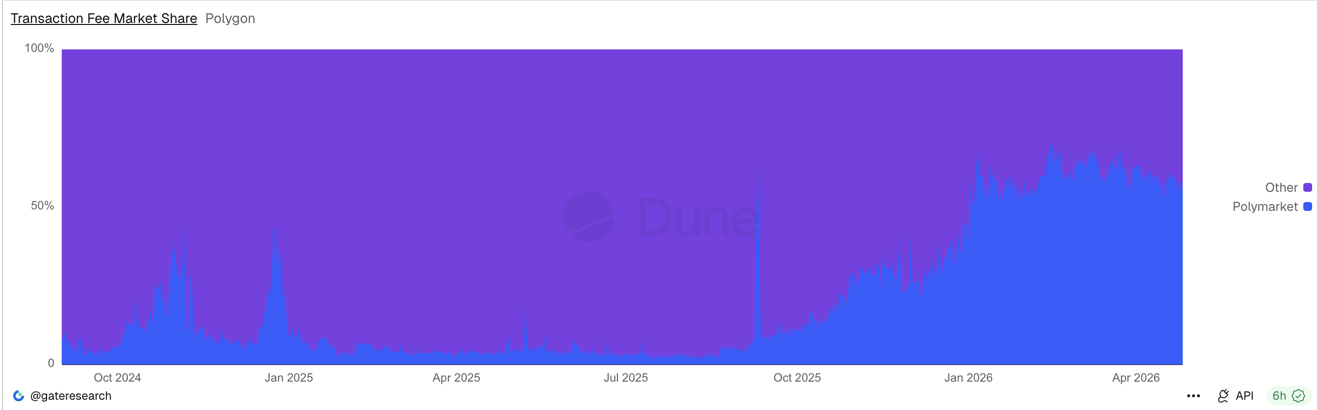 根據Dune資料顯示,從最新日度手續費組成來看,Polymarket已貢獻Polygon 56.3%的交易手續費。 Polygon每產生100美元手續費,其中約56美元來自Polymarket。這意味著,Polymarket是驅動Polygon整條鏈收入成長的核心來源。