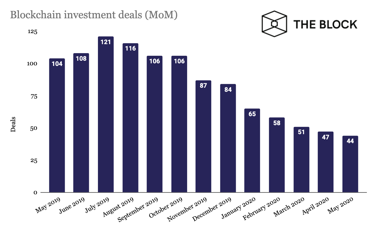 PANews 5月31日消息,根据The Block的研究,2020年5月期间共发生44笔区块链相关投资交易,与去年相比有显著下降。