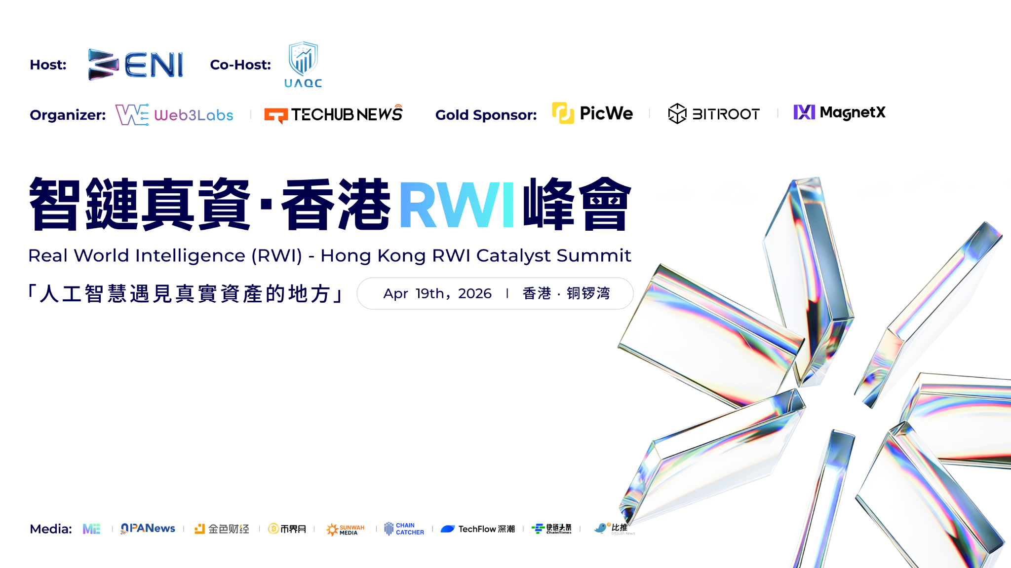 本次峰會由 ENI Network 主辦,UAQC 協辦,並由 Web3Labs 與 Techub News 聯合承辦,獲 Picwe、Bitroot、MagnetX 鼎力支持。峰會以「催化 AI 與真資的未來」為核心主題,聚焦人工智慧與真實世界資產(RWA)的深度融合,圍繞資產代幣化、合規框架演進及投資機遇等關鍵議題,展開前瞻性探討。