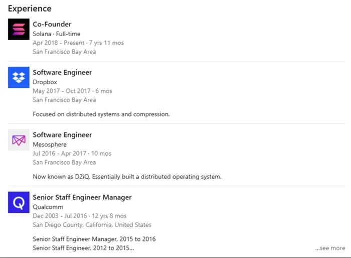 Anatoly Yakovenk 的学术背景侧重于分布式系统和压缩算法,这些技术领域后来被证明对他在区块链领域的创新至关重要,根据 LinkedIn 披露信息显示(如下图),毕业后他顺利加入高通公司,在那里从事操作系统级软件和分布式系统方面的工作超过十年,可谓做足了“牛马”,但在头部通信技术公司工作的这段经历也使 Anatoly Yakovenk 积累了构建处理大规模、高吞吐量系统的深厚专业知识。