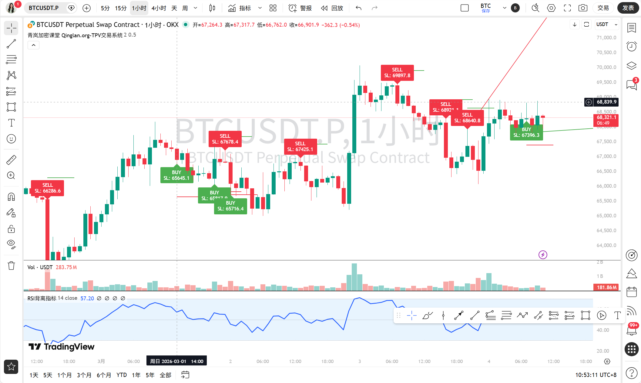 中期趋势预判: 震荡偏多/上涨趋势中的健康调整。在67500-68000区域有较强支撑,上方短期阻力在69000-69500,突破后有望测试70000甚至更高。