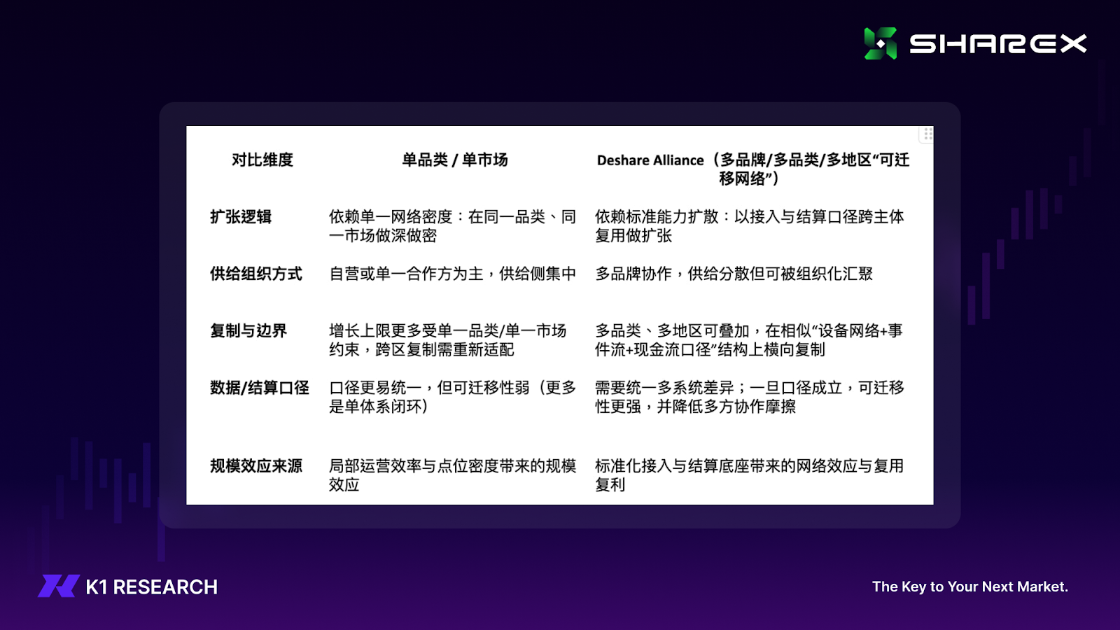 Deshare Alliance 的优势在于将扩张逻辑前置到“可迁移的供给网络”与“可复用的结算底座”上:通过多品牌、多品类、多地区的组织化接入,ShareX 得以在更真实、更复杂的环境中持续打磨标准化接入与统一口径。一旦这种标准能力稳定成立,后续无论是增长活动还是权益/资产化产品,都可以在同一底座上跨场景复用,从而把规模化从“单点运营能力”升级为“基础设施扩散能力”。