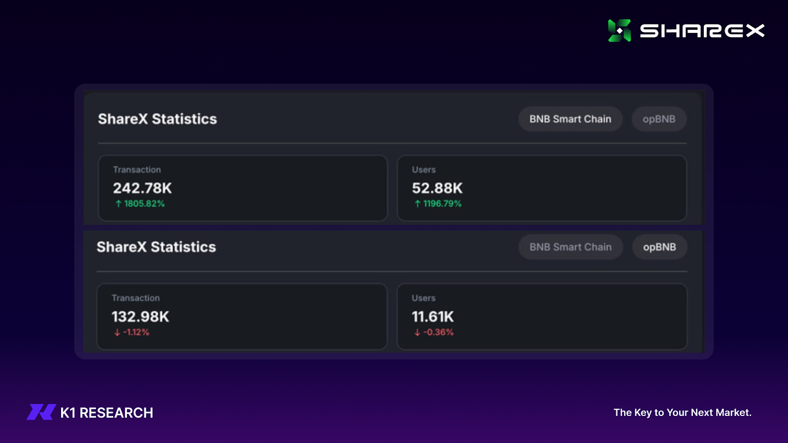 从链上交互数据看,RWA Dapp 在近阶段已形成一定规模:近一个月内, 375,760 笔交易(BSC 242,780;opBNB 132,980),64,490 用户(BSC 52,880;opBNB 11,610)。ShareX 的用户侧链路并非停留在一次性活动参与,而是在链上权益载体与交互行为上形成了持续运营的基础。