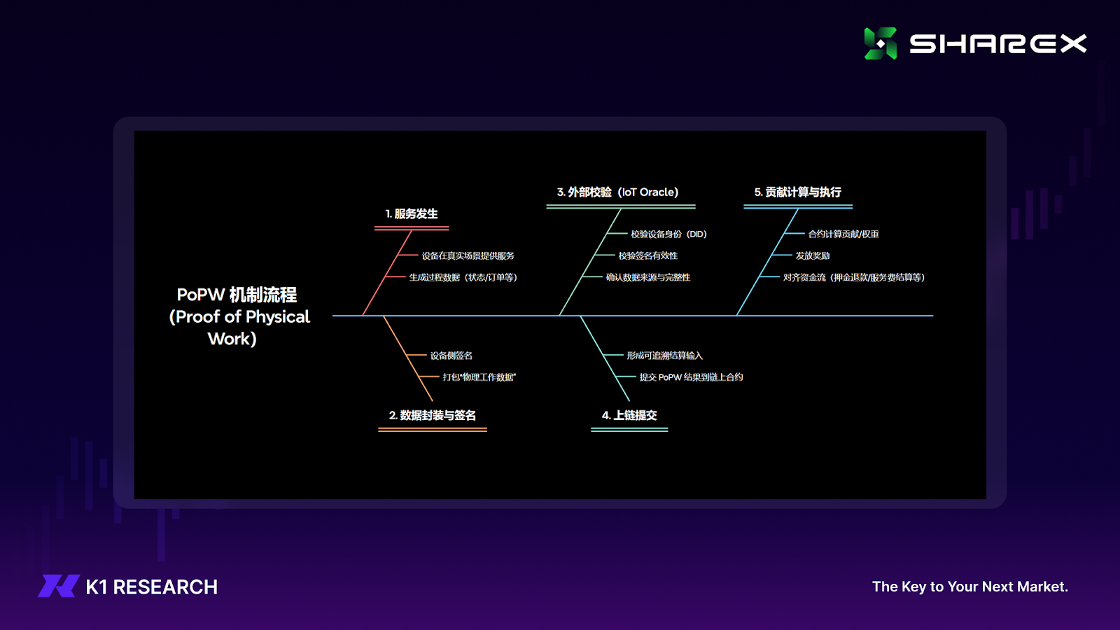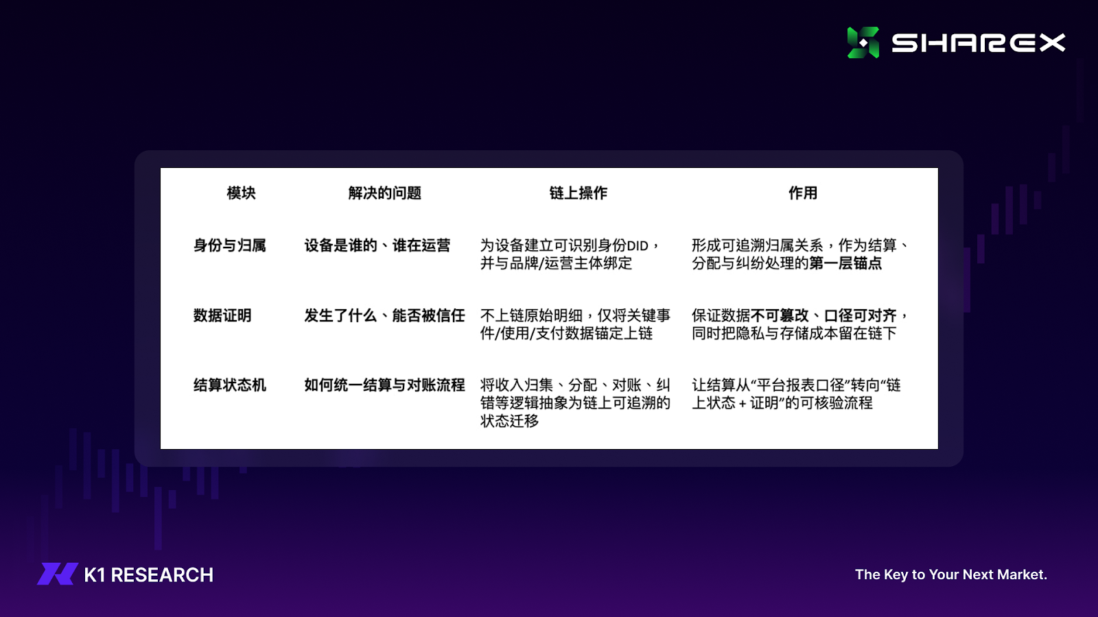 从产业链位置看,ShareX 更接近共享经济的 Web3 基础设施层,围绕“接入—验证—结算”建立底层能力: