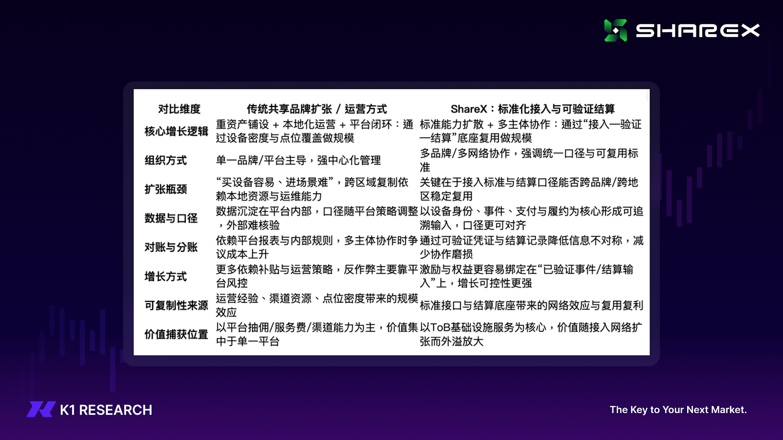 共享经济相关项目的竞争,并不只是“谁铺得更快、谁设备更多”,更核心的是谁能把扩张过程中最消耗资源的环节标准化:跨区域复制的接入成本、跨主体协作的对账成本、以及增长与分配规则的可信度。传统共享品牌往往把这些能力封装在自有平台与运营体系中,扩张越大,系统复杂度与协作摩擦越高;ShareX 则将其抽象为可复用的基础设施能力,以标准化接入 + 可验证结算口径切入,从而在产业链上占据更靠前的位置。