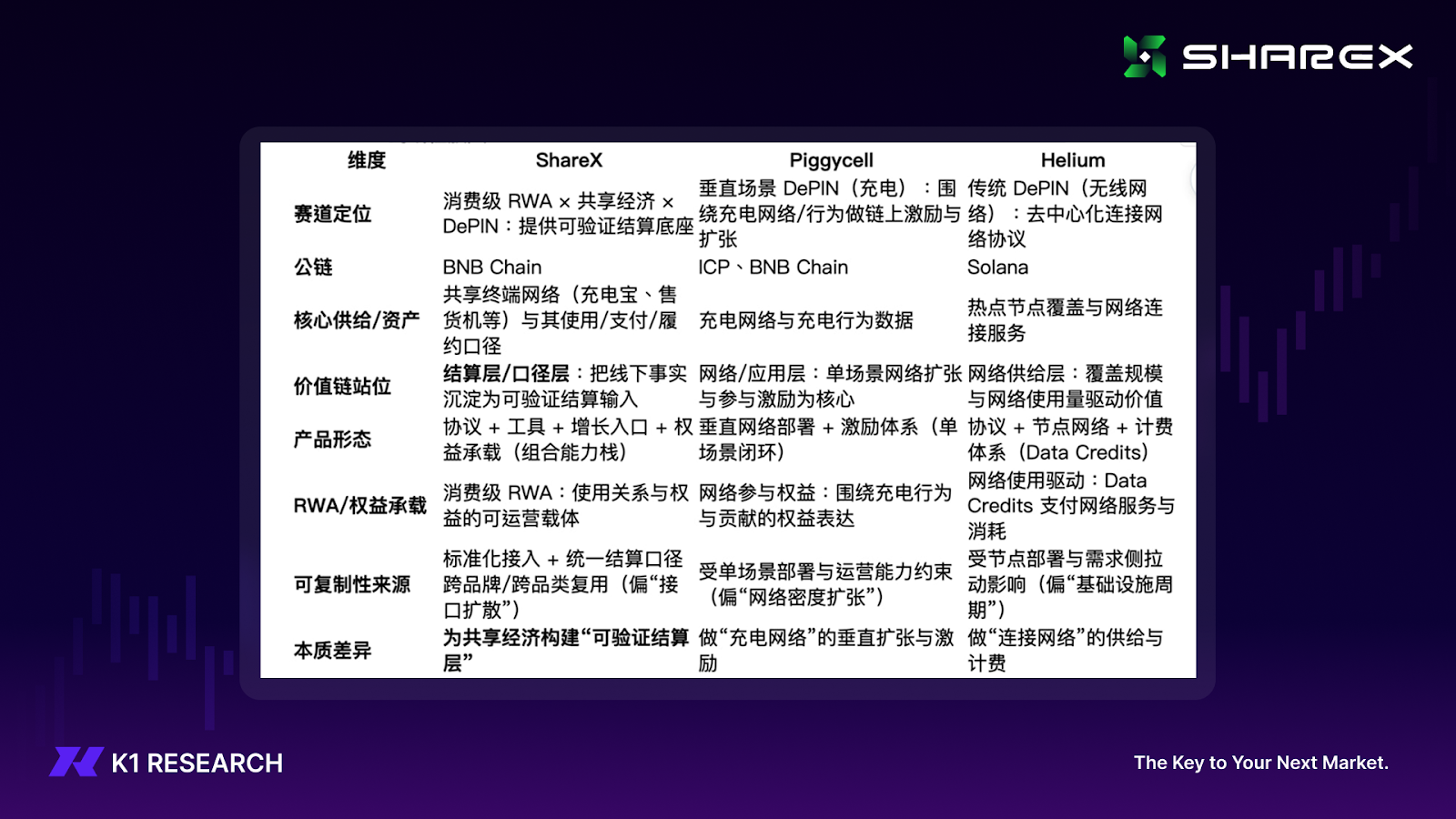 如果将 ShareX 放回Web3 竞争格局,其差异化也更清晰:传统 DePIN(以 Helium 为代表)解决的是“网络供给”问题:通过节点激励形成覆盖,再向终端与合作方输出连接服务;Piggycell更偏向特定终端品类的垂直网络扩张。而 ShareX 的差异在于其争夺的是共享经济的“结算标准与金融化接口”:将共享设备的真实使用、支付与履约沉淀为统一口径的可验证结算输入,并在其上承接权益与资产化产品,使扩张更接近“底座复用带来的复利”,而非单一网络密度的线性放大。