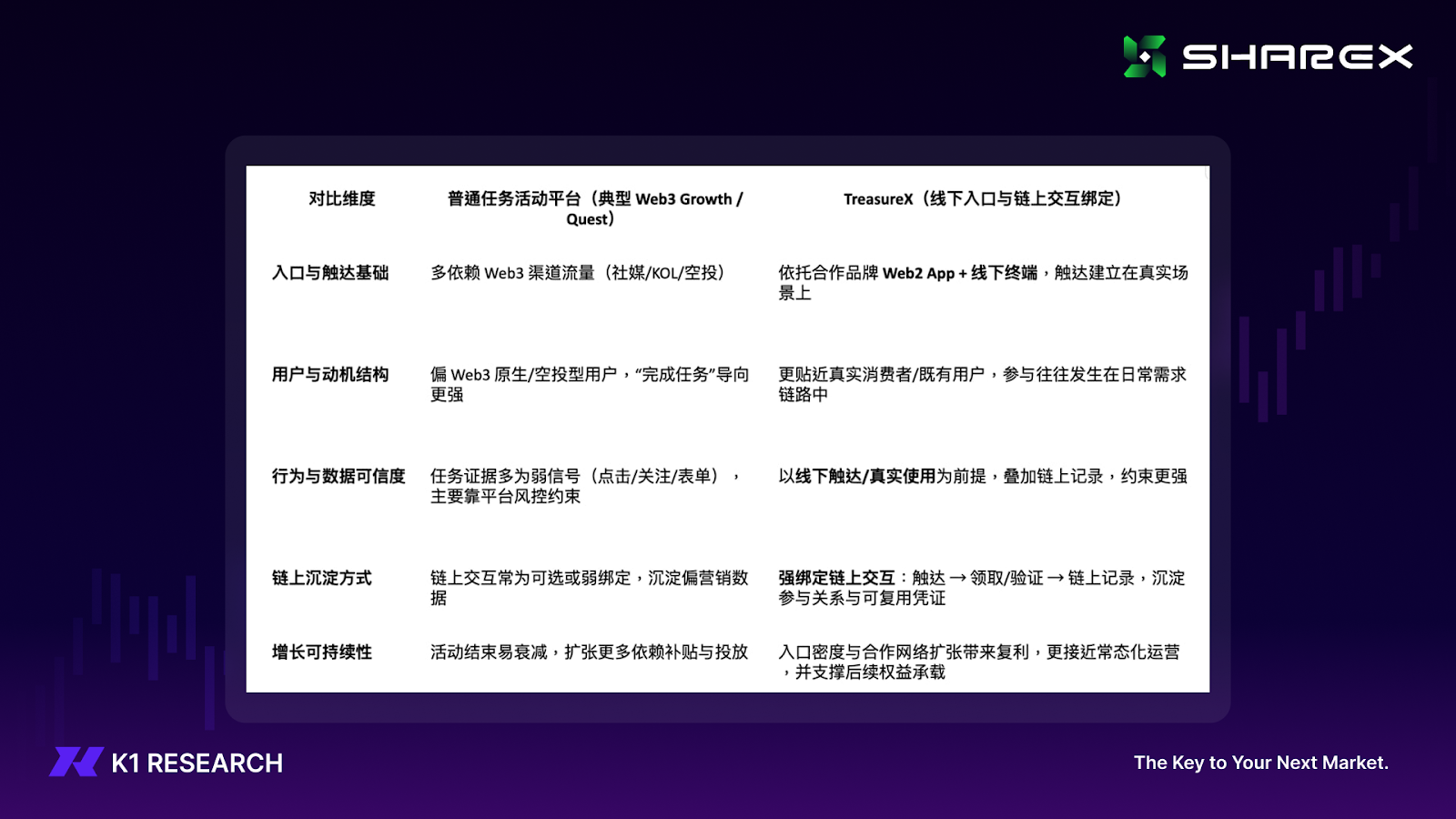 普通任务活动平台的增长通常建立在 Web3 渠道流量与补贴投放之上,缺乏稳定的 Web2 存量入口与真实消费底盘,因此容易形成“活动拉新—激励消退—用户流失”的短周期循环。TreasureX 的差异化在于:它把增长入口锚定在合作品牌的 Web2 App 与线下终端上,并将线下触达与链上交互强绑定,使参与更接近“使用即沉淀”的结构。TreasureX 的更大意义在于,一旦被长期证明,现实世界终端将不只是服务交付点,也可以成为用户获取、用户激活、链上凭证沉淀与品牌协同增长的入口。这使 ShareX 不只是掌握一个协议层,也开始掌握一套现实世界流量进入 Web3 的增长模板。