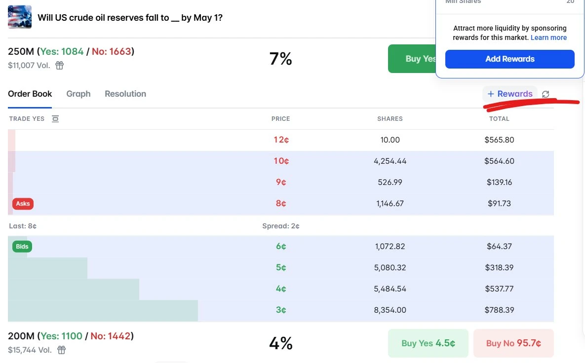 目前可在 polymarket.com/rewards 实时查看活跃奖励押注事件和个人收益。激励利差范围在订单簿界面以蓝色高亮显示,用户也可以查看 Polymarket 官方文档
