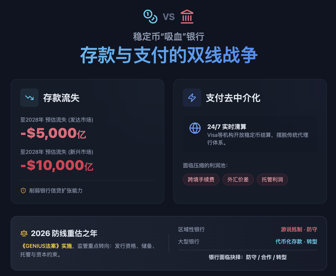 • 对银行体系冲击:导致存款迁移和支付脱媒,侵蚀银行中间业务收入。