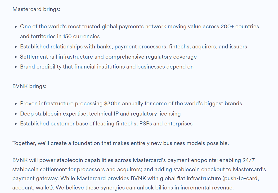 BVNK 在最新官方 Blog 中也明确写到,未来双方的协同方向包括由 BVNK 为 Mastercard 的支付端点提供稳定币能力,为处理商和收单机构实现 24 小时稳定币结算,并将稳定币结账能力纳入 Mastercard 支付网关,并直言这些协同效应有望带来数十亿美元的新增收入。