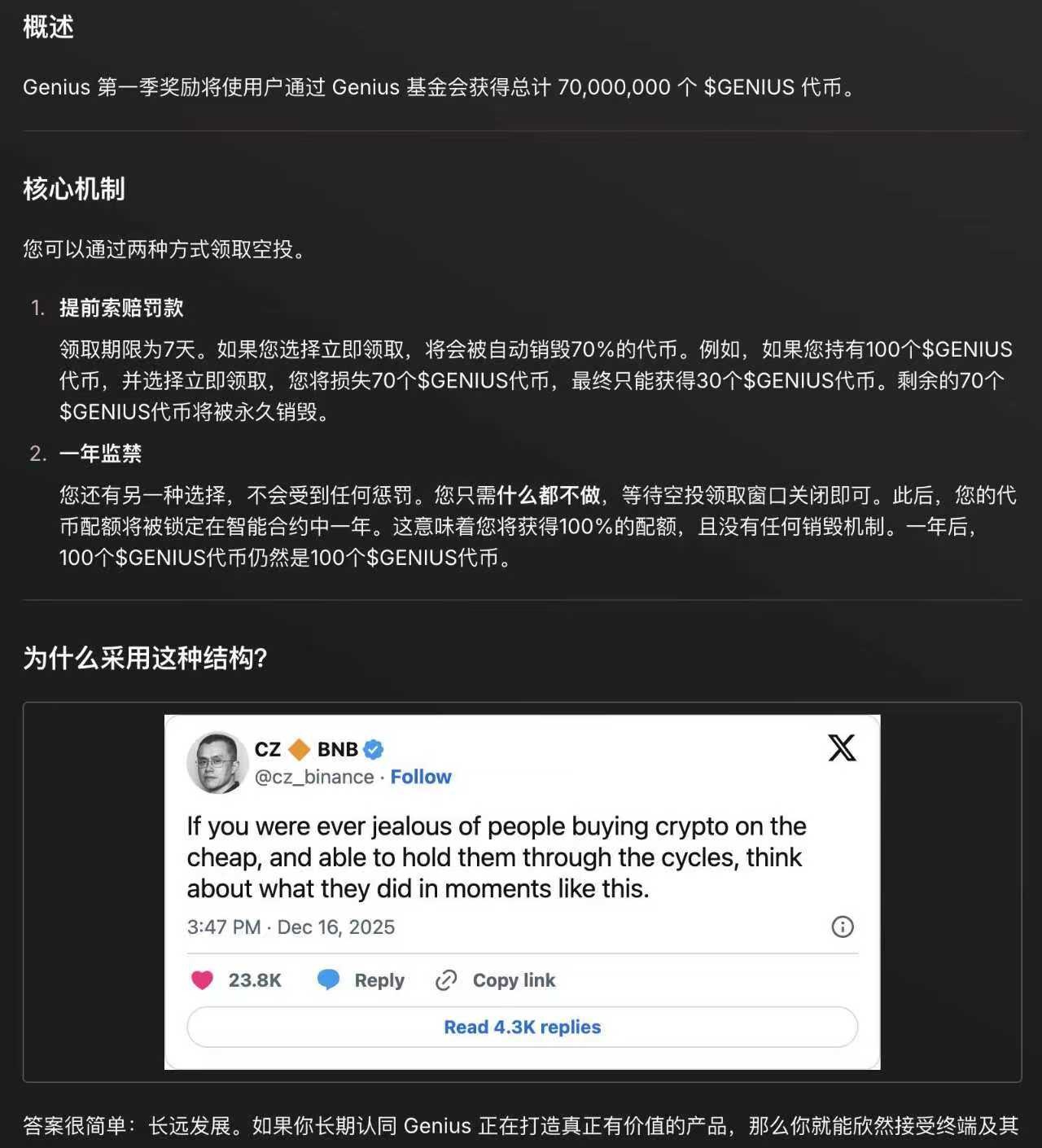 ●反撸过程:Genius被视为最后希望,然而社区疯狂刷交易量后,TGE迎来反转大礼包:7天内立即领取空投将自动销毁70%代币,最多拿30%;或选择锁仓一年才能拿全额。在汹涌的舆论压力下,项目方随后紧急推出“退款”选项 - TGE后48小时内,用户可选择100%销毁空投额度,换取Genius收取的手续费退款。