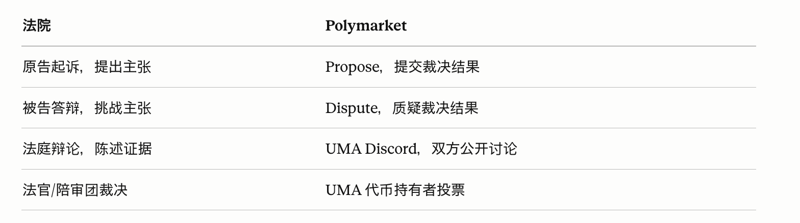 二、Polymarket 与传统法院:同一套逻辑,不同的设计