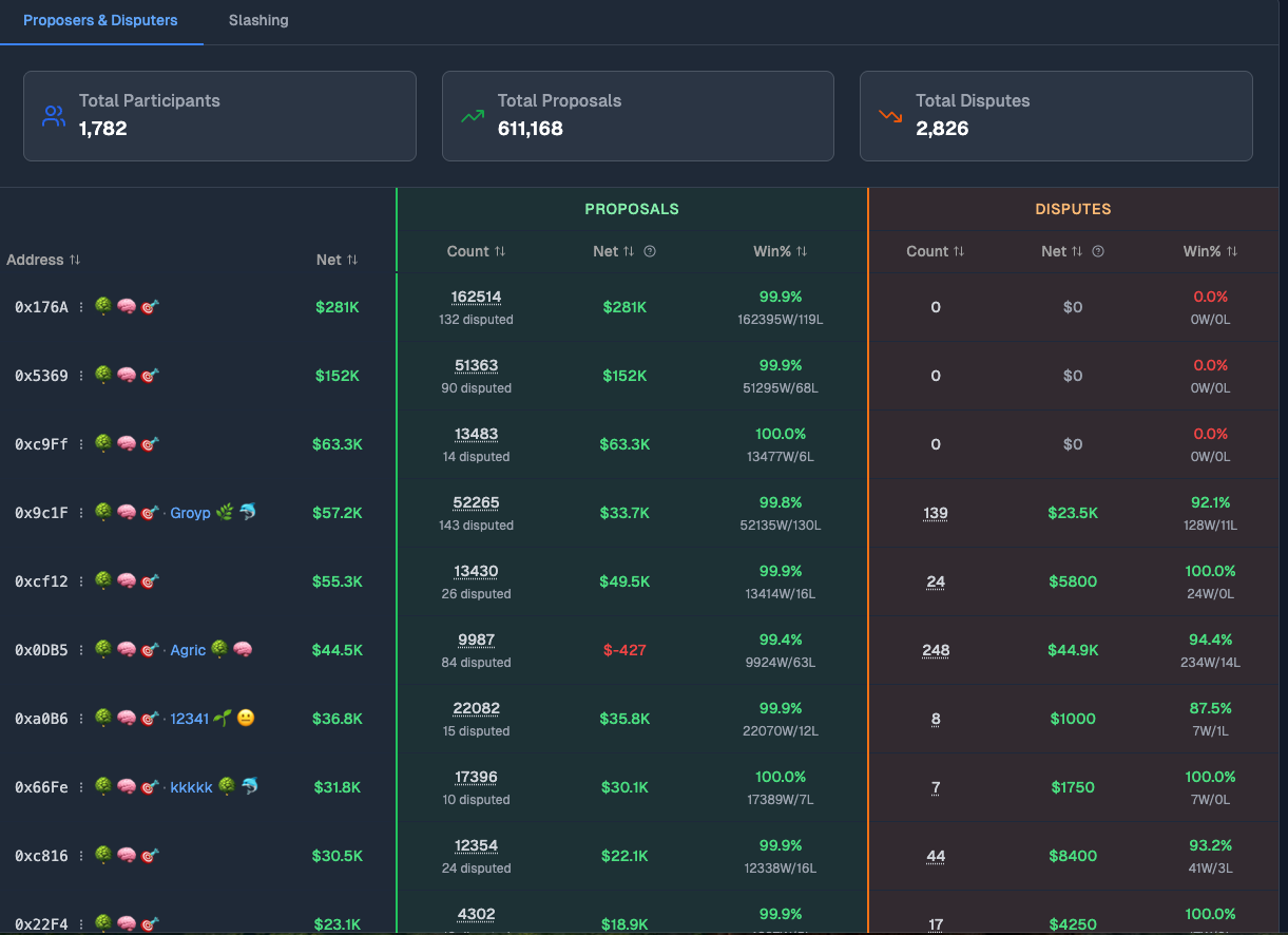 市场上很少有人专门做Dispute 的用户,在 Dispute 环节赚最多的用户为0xB7A ,盈利金额为$17123 。