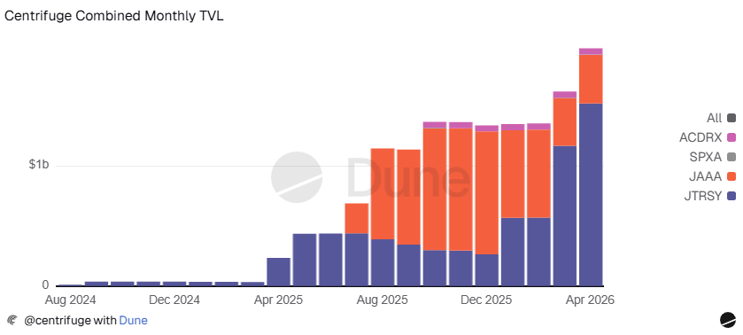 Centrifuge 的报告既展现了 RWA 的机遇,也揭示了其面临的差距。它是最大的代币化平台之一,旗下机构产品 AUM 超过 18.5 亿美元:JTRSY(美国国债代币化基金)规模达 15.2 亿美元,JAAA(AAA 级 CLO 代币化基金)规模达 4.03 亿美元,ACRDX(阿波罗多元化信贷基金)规模达 5200 万美元,以及近期推出的 SPXA(首个标普 500 指数代币化基金)规模达 370 万美元。然而,其中只有约 1300 万美元在 DeFi 中具有可组合性:主要通过 deRWA 封装代币(wrappers)以及 Horizon 上的 JAAA 实现。