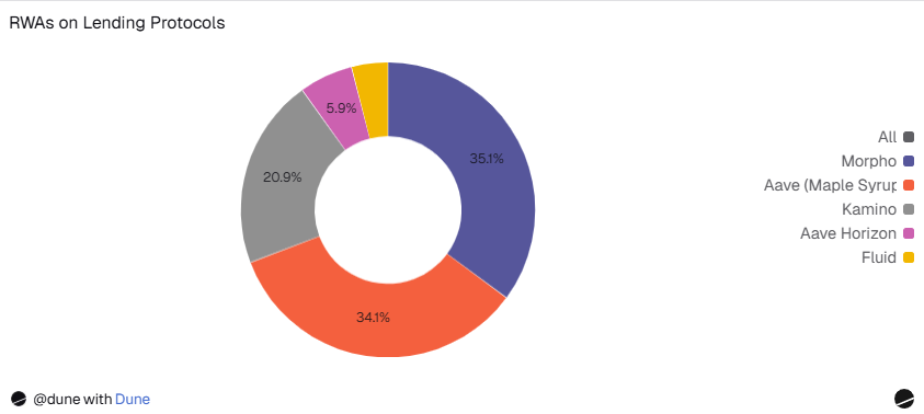 信贷资产占据主导地位是因为其盈利模式。Maple 的 syrupUSDC 收益率约为 6%,而国债(T-Bills)的收益率约为 3.5%。当你的抵押品能赚取 6% 的收益,而你又能以 3% 的利率借入稳定币时,你就获得了正收益。像 Gauntlet 这样的策展人在此基础上构建了明确的循环策略:存入 RWA 作为抵押,借出资金,然后再买入更多。这是经过设计和风险管理的杠杆。这也解释了为什么信贷资产出现在每个主要借贷平台上:Morpho 上 9.57 亿美元,Aave 上 9.29 亿美元,Kamino 上 4.76 亿美元。