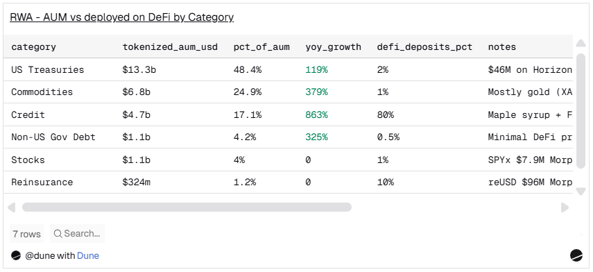 美国国债占代币化 AUM 的 48.5%(132 亿美元),但在 DeFi 存款中仅占 2%。信贷资产占 AUM 的 17%,但却占据了存款的约 80%。大宗商品占 AUM 的 25.2%,但在 DeFi 存款中几乎不到 1%。