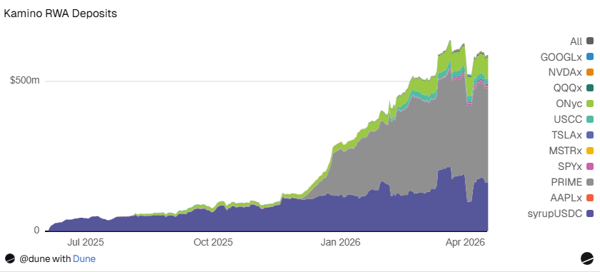 - Kamino(5.87 亿美元):Solana 上最大的借贷协议和 RWA 平台。其中 PRIME 为 3.15 亿美元(HELOC 借贷收益),syrupUSDC 为 1.61 亿美元,ONyc 为 7100 万美元(再保险),USCC 为 1800 万美元,外加 xStocks 市场(涵盖七种代币化股票,总额达 2100 万美元)。