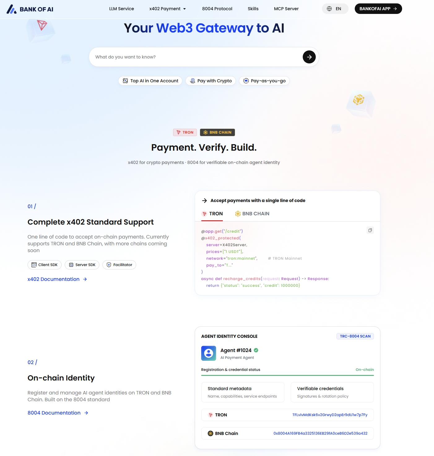 支付层是 Agent 从信息处理工具跃迁为真正经济主体的关键一环。前文已经阐述 x402 协议的技术原理与治理架构,本节聚焦其在 TRON 生态中的典型落地案例——Bank of AI(https://bankofai.io/),它是 AI Agent 时代基础金融设施 白B.AI(https://b.ai/)产品的重要组成模块。这一案例之所以具有代表性,在于它并未停留在协议层的抽象讨论,而是首次将 x402、ERC-8004、MCP Server、Skills 以及 OpenClaw 扩展五大核心组件打包成完整的 Agent 金融操作系统,使 Agent 在真实链上环境中具备了端到端的业务执行能力。