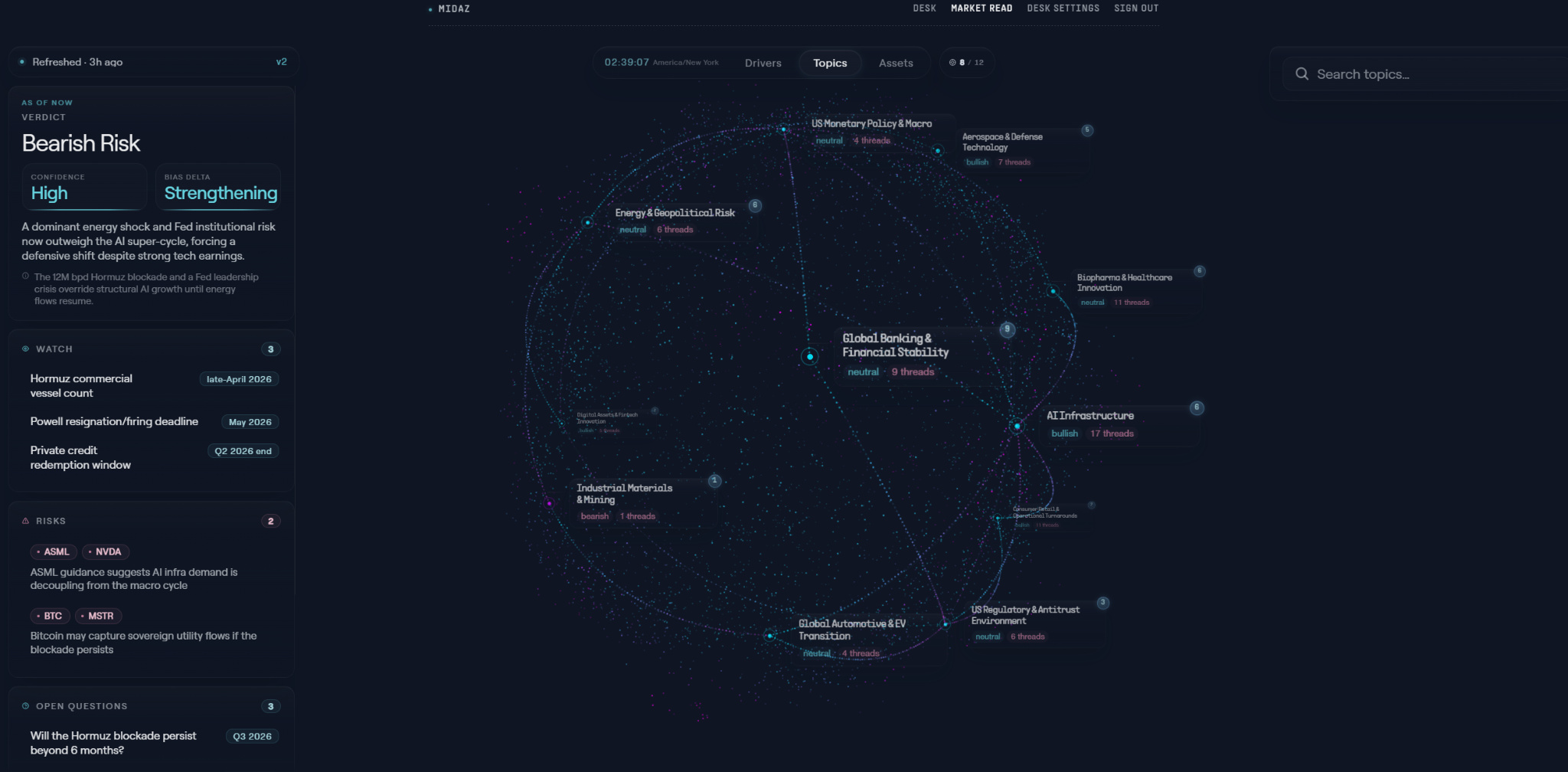 Midaz(midaz.xyz)是当前这一方向上最具代表性的实践。其核心理念可以用一句话概括:Built for Agents, Visualized for Humans。作为 2025 年币安黑客松的获奖队伍,Midaz的核心团队成员来自 Millennium、Citadel等华尔街顶级量化基金,将市场信息重构为三个结构化层次:Assets 层对应具体交易标的,Topics 层将围绕资产的事件与信号聚合为带有方向性判断的市场主题,Drivers 层则进一步抽象出驱动这些主题演变的因果力量——例如美国滞胀与消费信贷周期断裂、AI 基础设施扩张与定制芯片采用等。