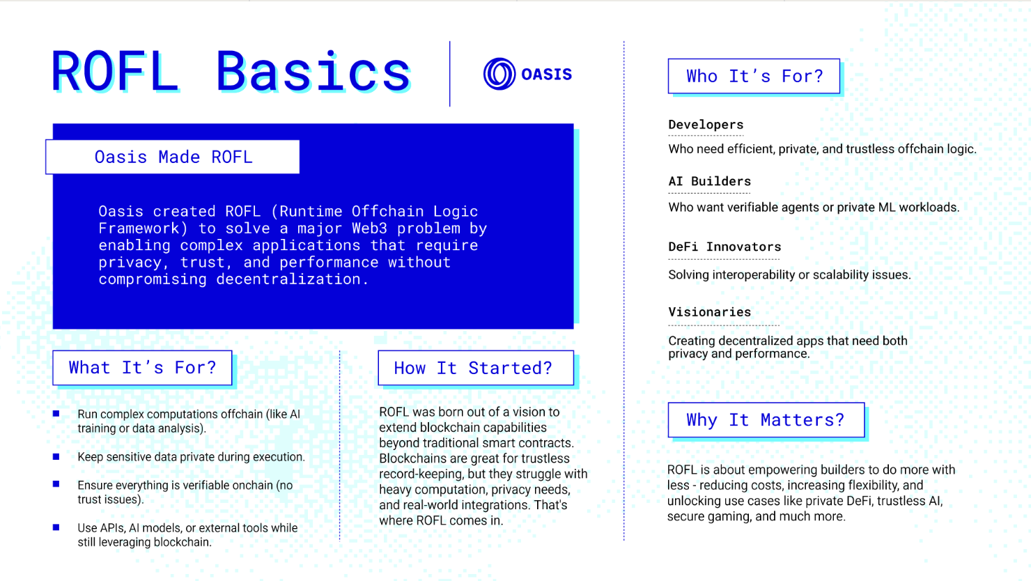目前在这个方向上集成最领先的项目,是 Oasis Protocol 的 ROFL(Runtime Offchain Logic)。Oasis Protocol 是一条主打隐私保护的 Layer1,而 ROFL 是 Oasis 自己开发的一个计算框架,全称 Runtime Offchain Logic,直译就是"链外运行逻辑"——它解决的问题很具体:怎么让链下发生的计算,被链上信任。ROFL 模块上线后,定位是面向 AI 应用的"Trustless AWS":开发者可以在链下的可信执行环境(TEE)中运行 Agent 代码,计算结果经密码学证明后写回链上,整个过程不依赖任何中心化运营方的信誉背书。