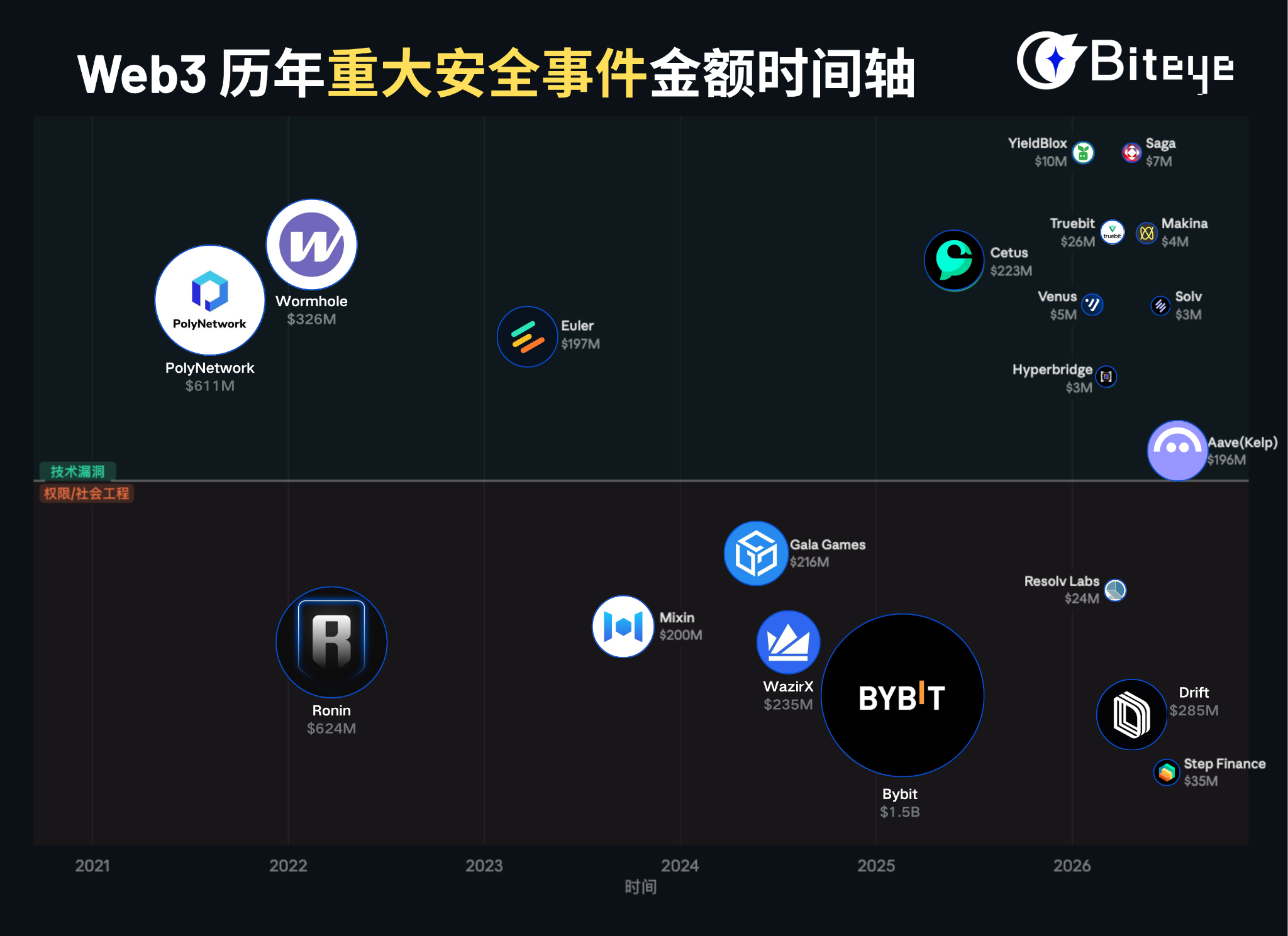 早期的技术漏洞高度集中在跨链桥,跨链桥是那个阶段 DeFi 扩张最快、代码最新、审计最薄弱的基础设施。它承载了大量资产,却还没有经历足够多的对抗性检验。