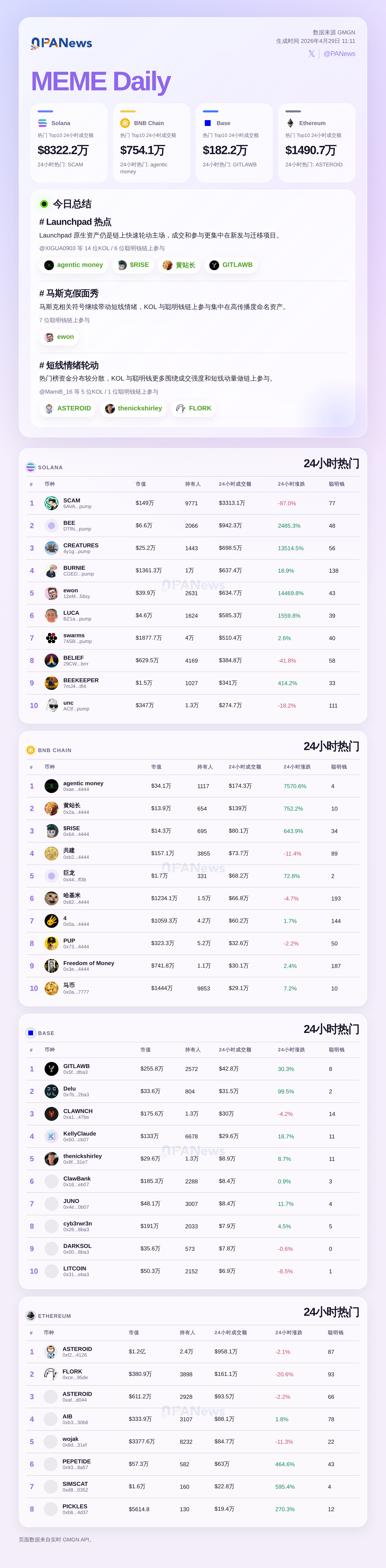 BNB Chain 上 $agentic money 表现突出;Base 由 $GITLAWB 领跑;Ethereum 上 $ASTEROID 继续保持热度。