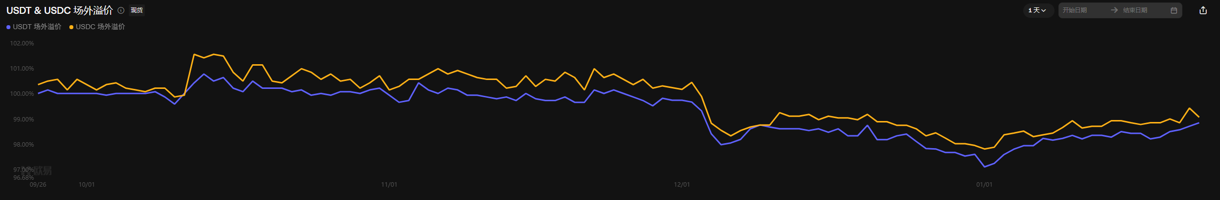 本周 USDT、USDC 场外溢价率随大盘回落小幅回升,但回升幅度有限,仅少量场外资金趁跌抄底,市场整体情绪仍处于中性冷静状态,未出现大规模场外资金进场迹象。