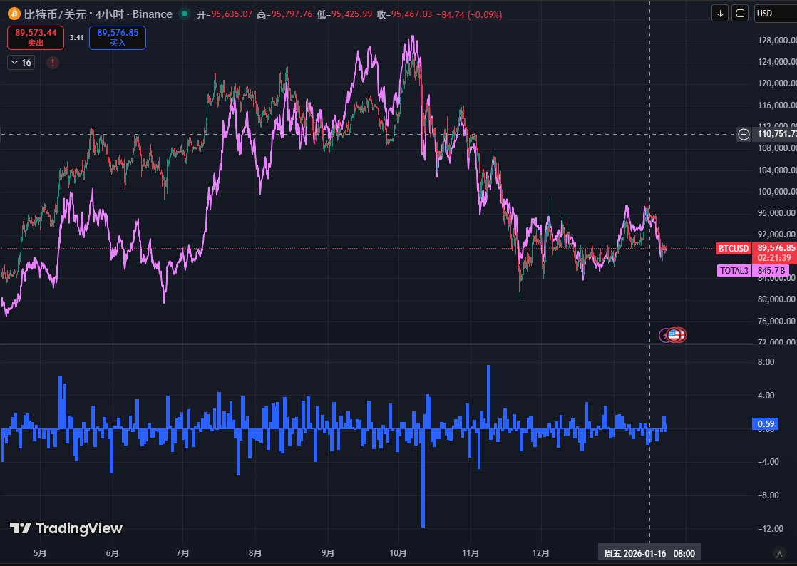 - 恐慌杀跌:1 月 21-22 日市场出现恐慌性抛盘,多头止损盘大量触发,不过低位成交量放大,88000 美元一线出现左侧资金接盘,暂时阻断跌势;