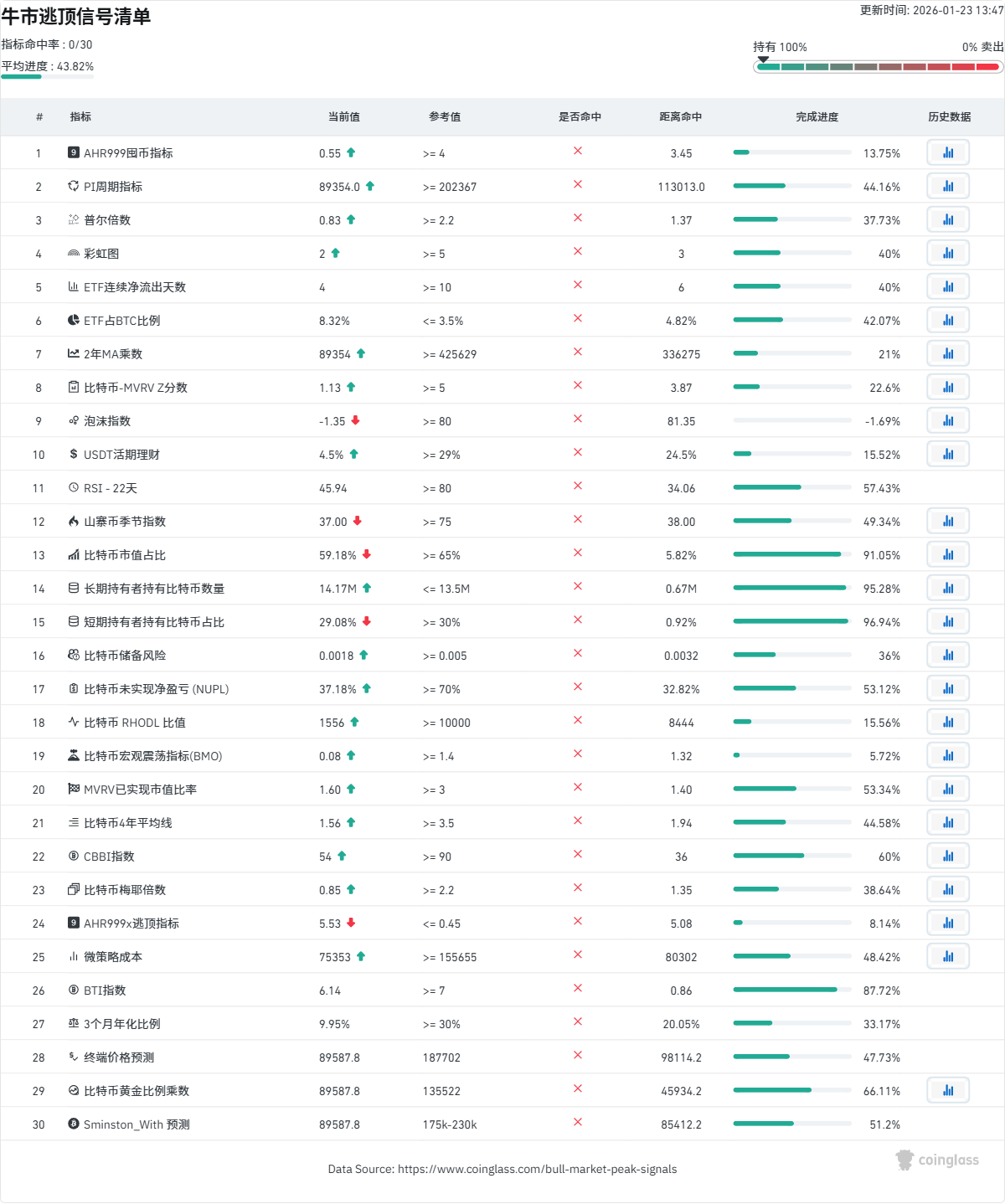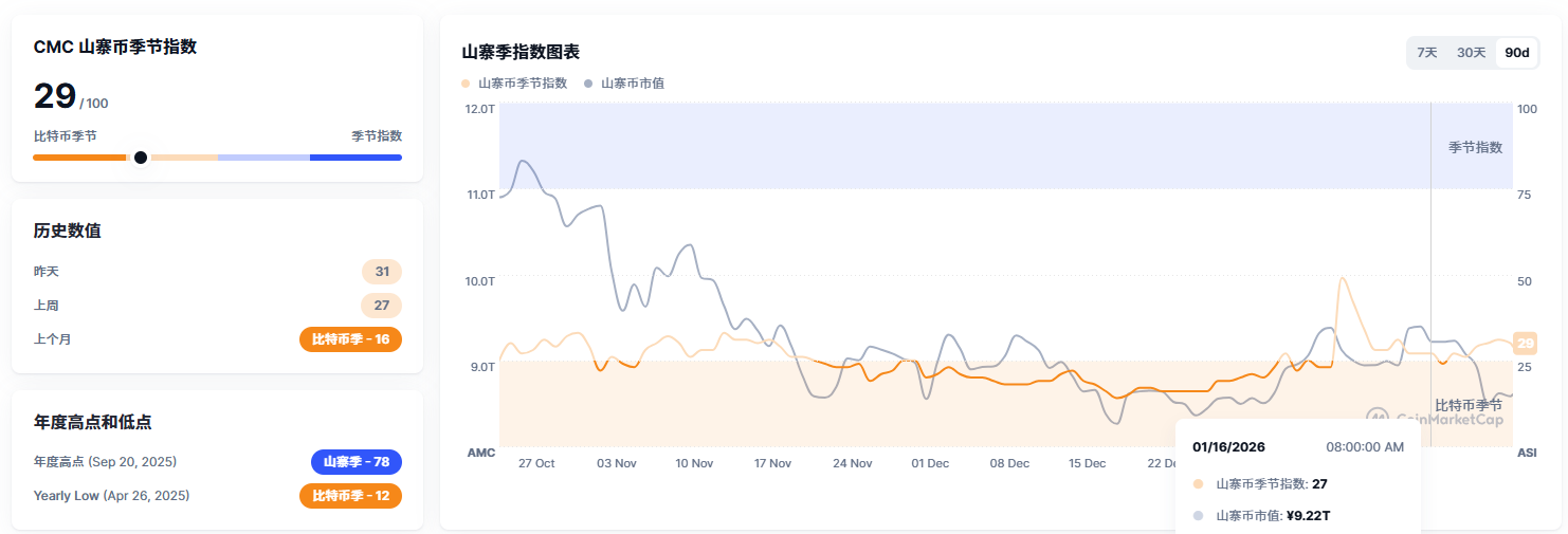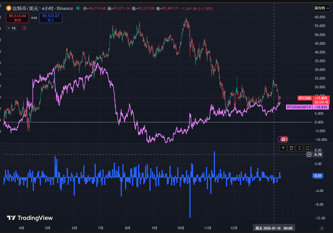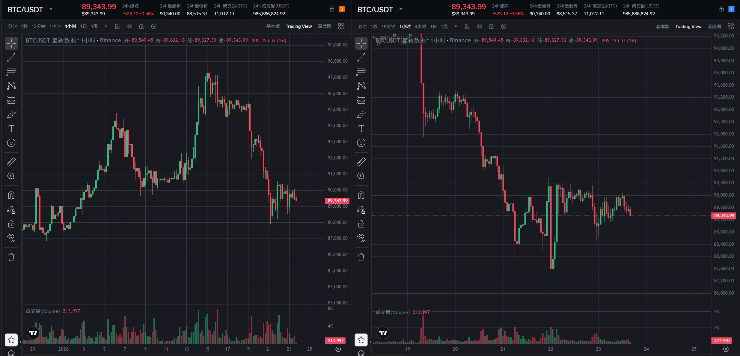 - 缩量修复:1 月 23 日至今进入大跌后的 “垃圾时间”,多头反攻乏力,未能站上 91000 美元,空头也进入休整,这种缩量横盘通常为下跌中继信号。