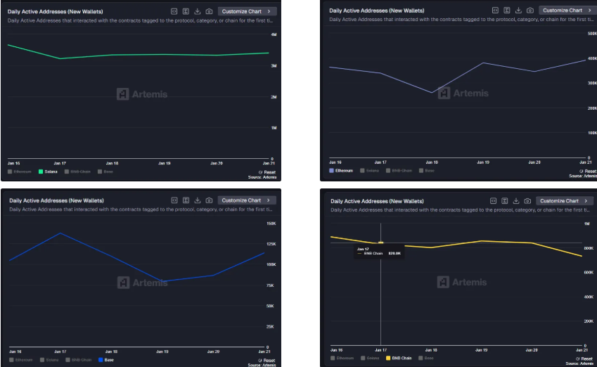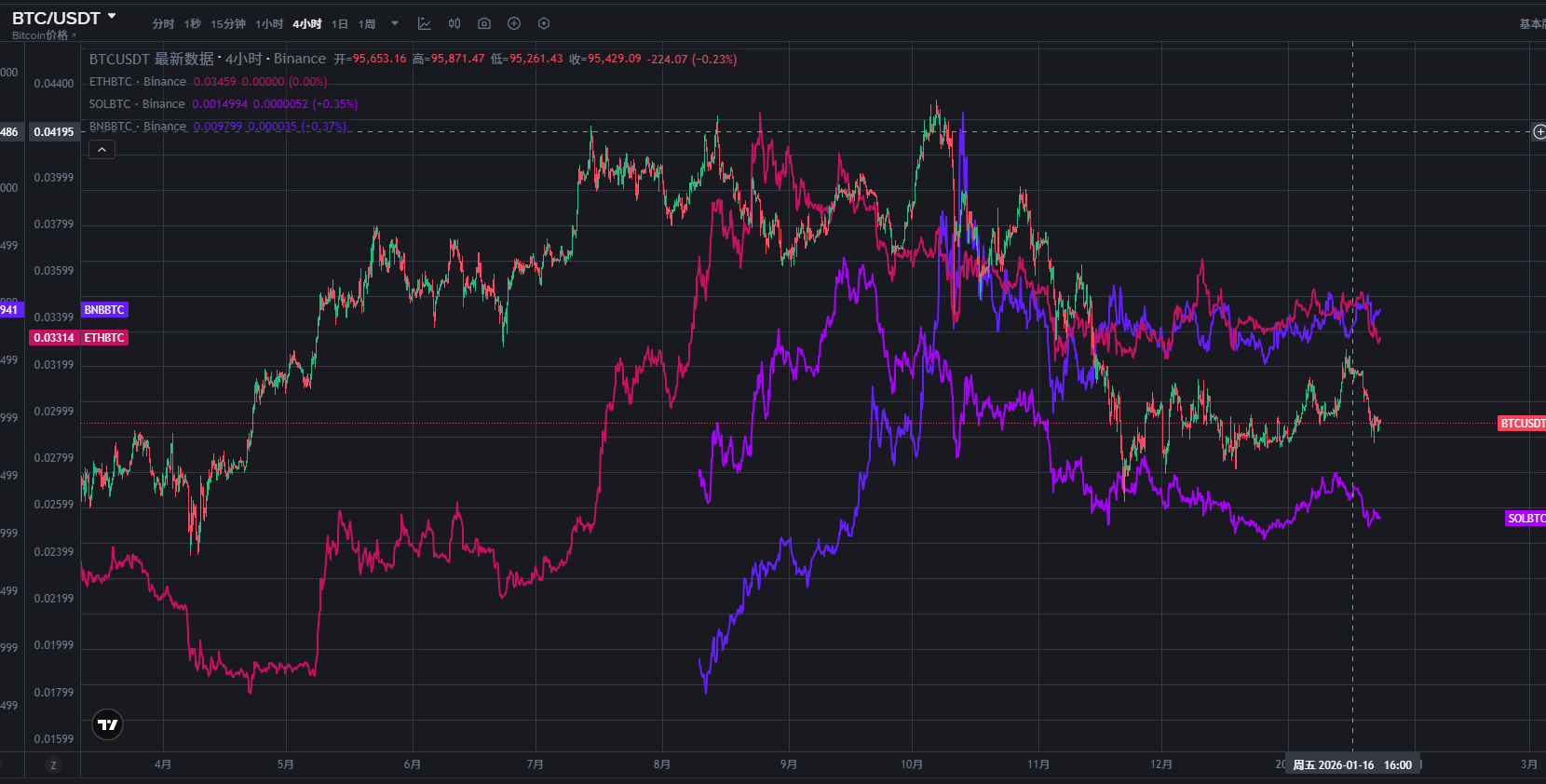 - 主流公链兑 BTC 汇率:SOL/BTC、ETH/BTC、BNB/BTC 汇率震荡走高,且下跌幅度较小,整体趋势未变,主流公链相对 BTC 的强势格局延续。