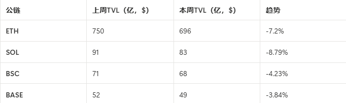 三、一级市场数据分析:公链 TVL 普跌,链上热度未完全消散