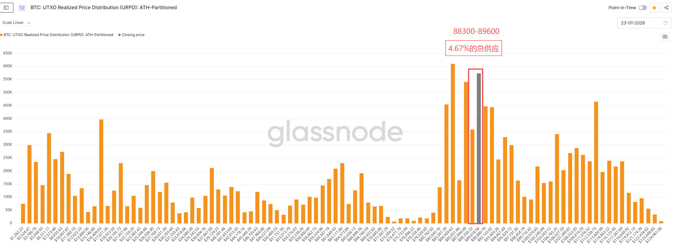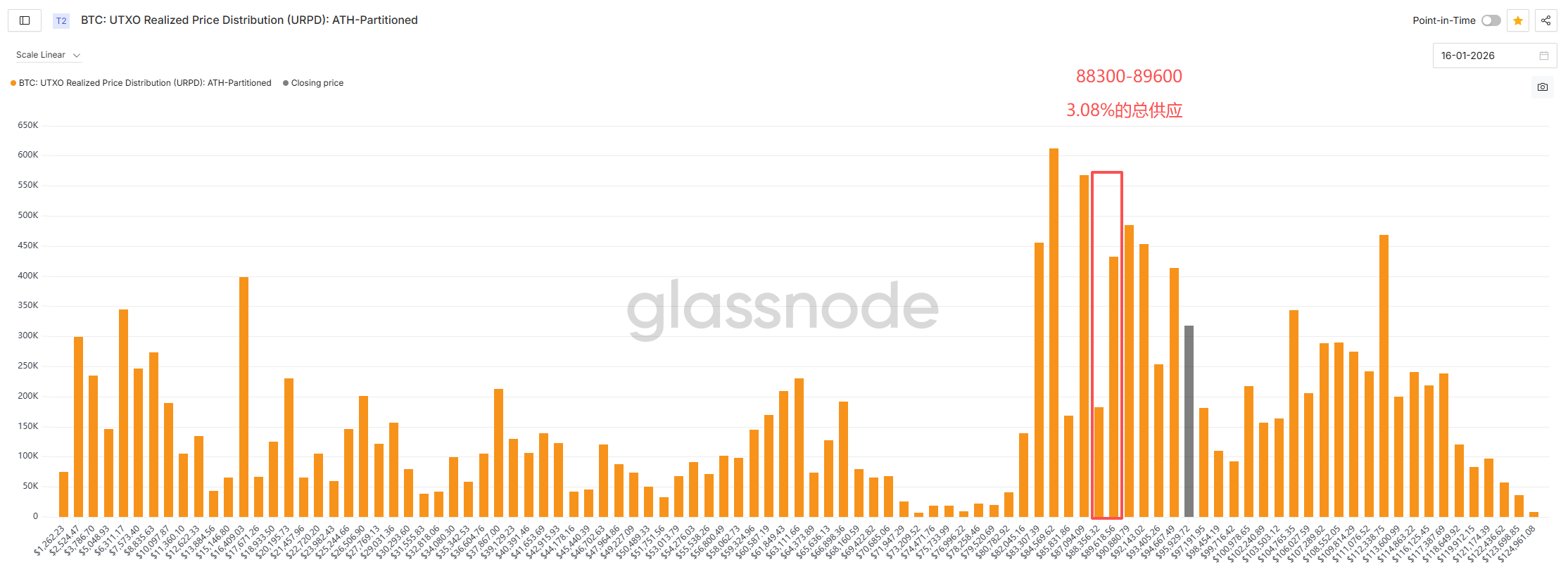 本周 BTC 价格回落之后,88300-89600 美元区间的筹码积累量从总供应的 3.08% 上升至 4.67%,增加 1.59%,该区间出现明显的筹码换手。若后续价格未有效跌破该区间,且筹码积累量持续上升,将为行情后续反弹奠定基础。