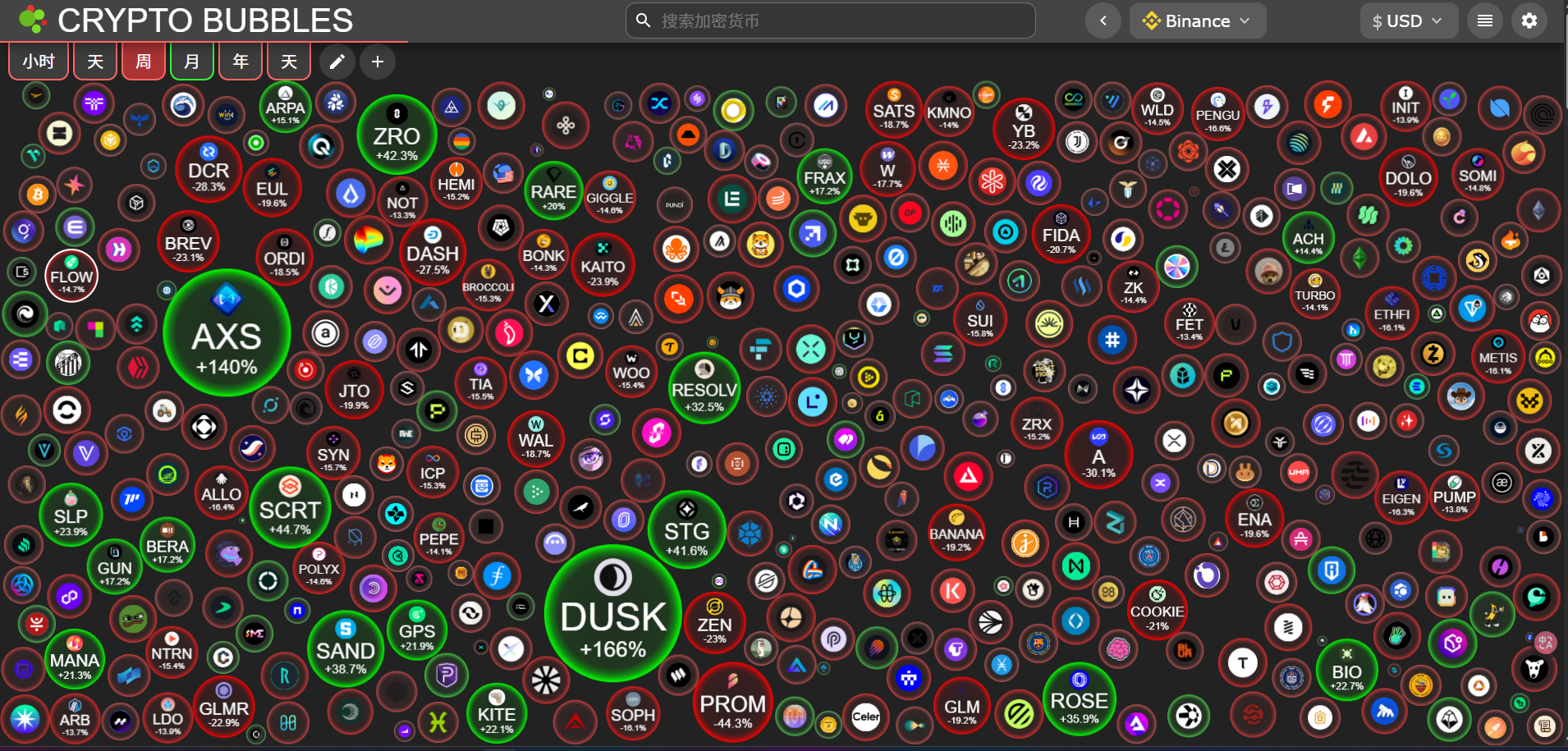 - 局部亮点:本周山寨虽整体普跌,但前半周跑输 BTC、后半周随 BTC 企稳开始轮动,SKR 涨幅明显,ZRO、STG、AXS 等中大盘币种走出趋势性行情,赚钱效应对市场情绪形成支撑。