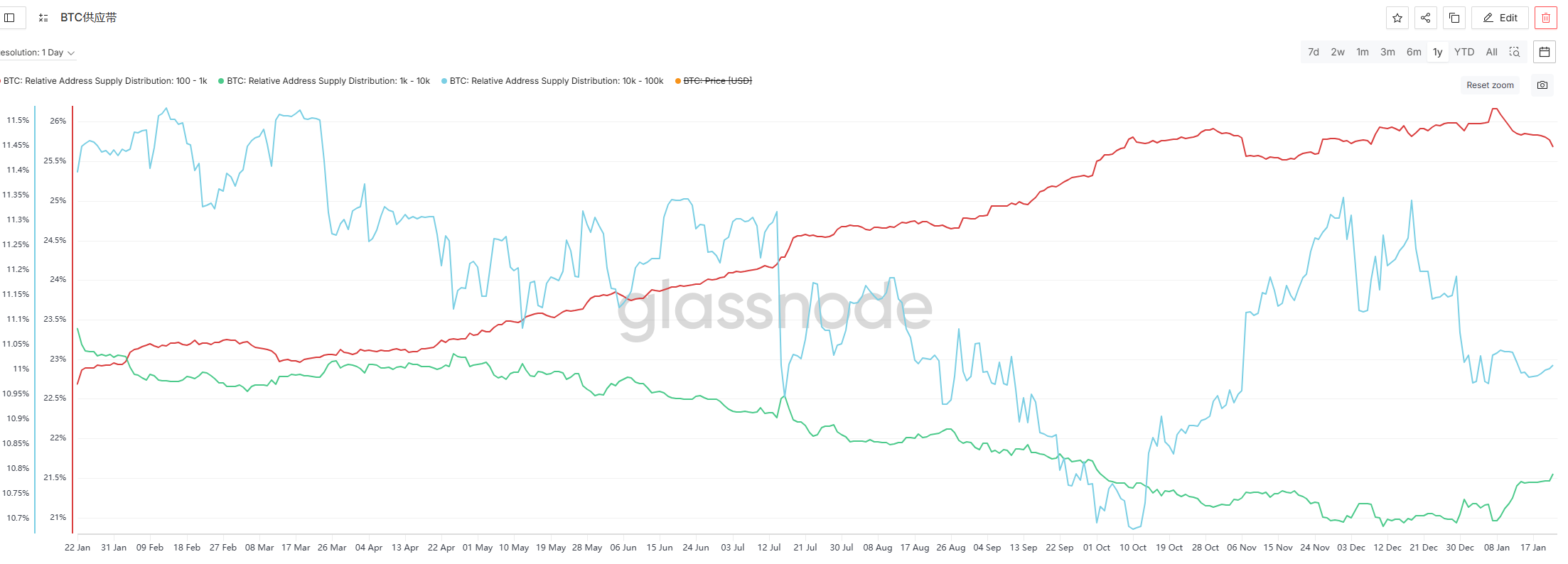本周 BTC 不同规模持币地址呈现明显分化:100-1K 枚地址持币占比从 1 月 8 日的 26.162% 回落至 25.677%,减持迹象明显;1K-10K 枚地址持币占比从 20.959% 升至 21.554%,增持动作显著;10K-100K 枚地址持币占比小幅回升,从 10.984% 升至 11.009%,整体变化有限。