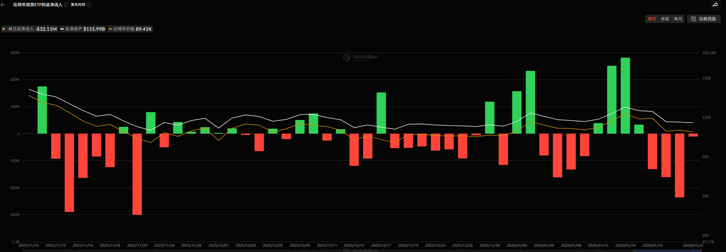 - 特朗普格陵兰岛争端引贸易摩擦担忧:1 月 21 日特朗普达沃斯演讲重申格陵兰战略兴趣,初期威胁对欧盟加征关税(2 月 10%、6 月 25%),虽 22 日取消威胁,但前期不确定性已引发市场恐慌。贸易战担忧推升全球供应链焦虑,风险偏好急速降温,BTC 当日从 92k 快速跌破 90k,多头爆仓超 4 亿美元,主导周初弱势情绪。