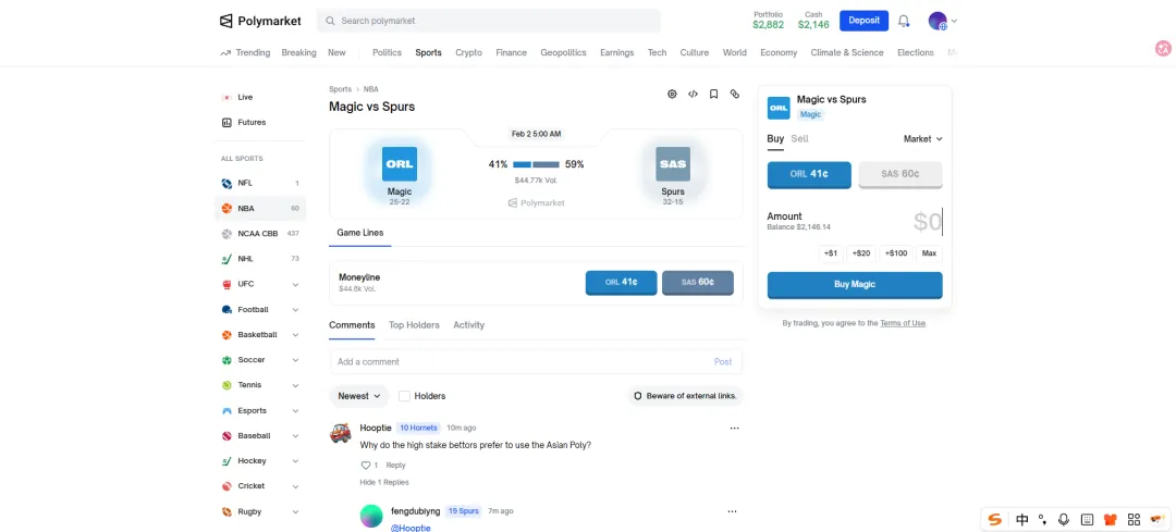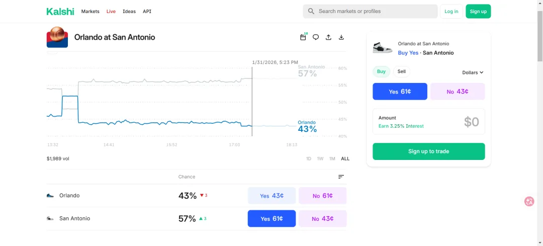 如果你分别在平台B买入魔术队获胜(41¢)和在平台A买入马刺队获胜(57¢),总成本 = 41¢ + 57¢ = 98¢。